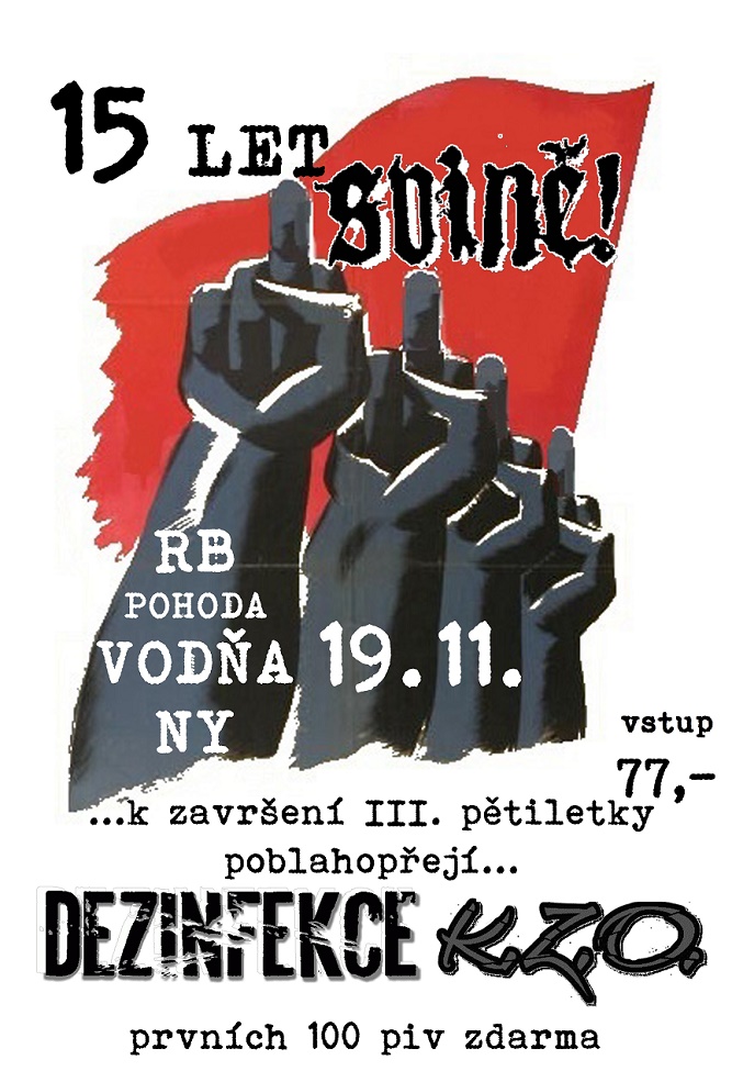 SVINĚ! slaví 15. let na scéně. Nečejte velké pózy, světla, ani podium. Co naopak čekat můžete, je vyjímečně dlouhej set, během kterýho Svině! zahrajou kopici letitejch vykopávek a abysme jen nevzpomínali, přidaj i pár zbrusu novejch songů. Na koncertu si budete moci koupit nějaký cédéčka, sedmipalce i speciální výroční trička kapely.