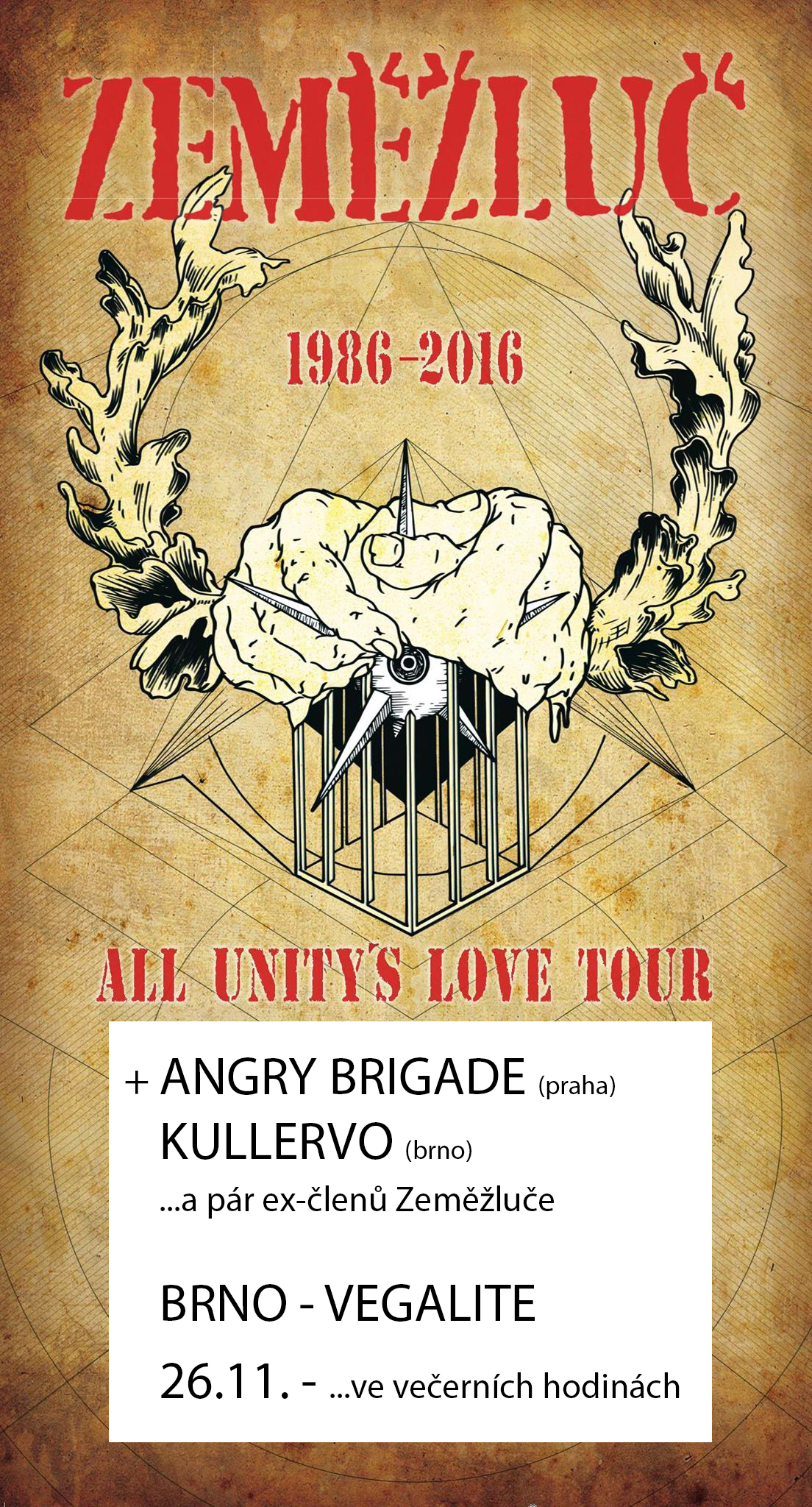 ZEMĚŽLUČ - Brněnský koncert v rámci tour "All unity´s love". Na podiu se taky objeví pár ex-členů jako například dlouholetý kytarista Eda nebo bubeník Sam, kterého můžete znát například z desky "System Kanibal"