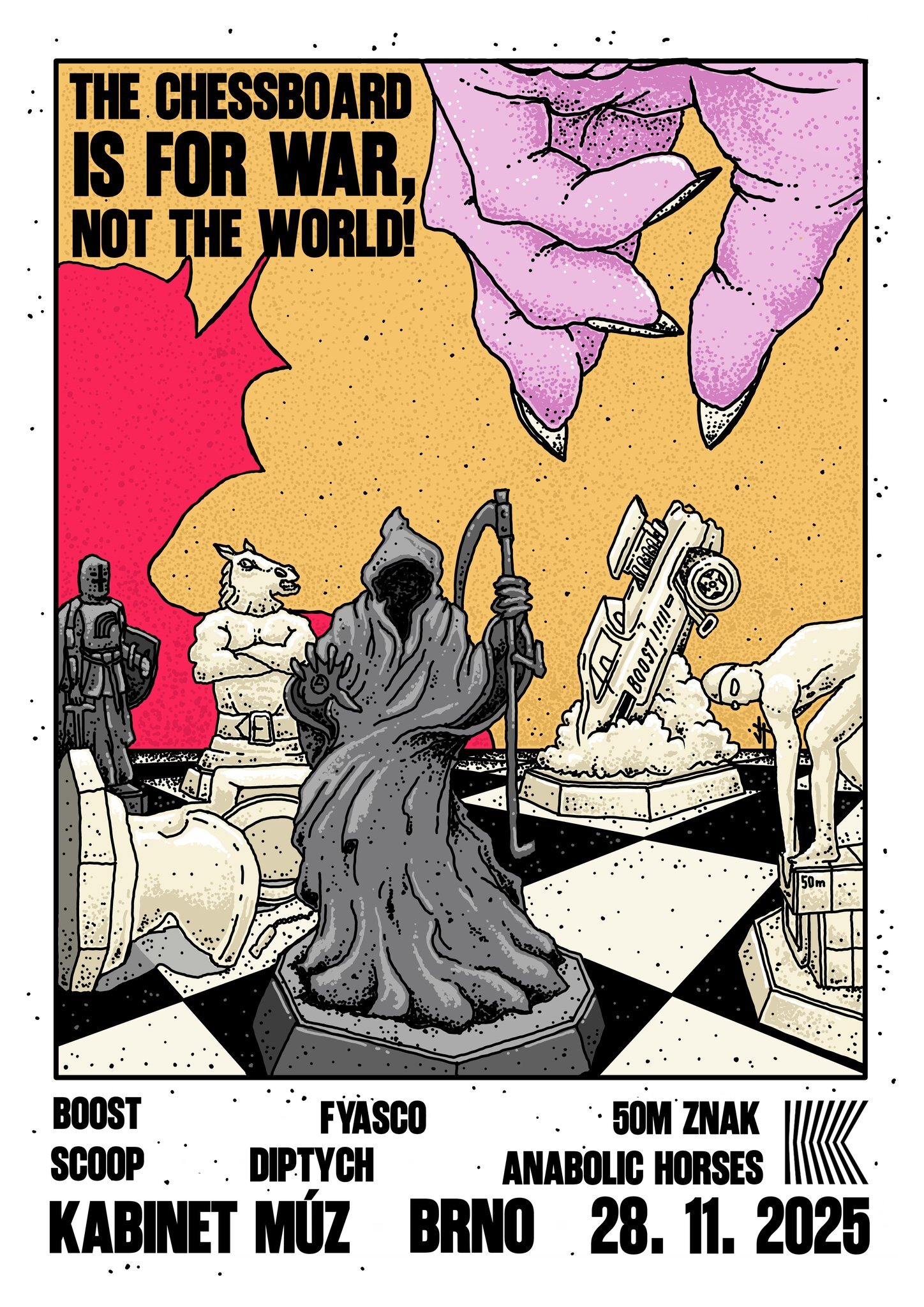 Mladá hardcore kapela z Prahy svou první nahrávku vydala na kazetě v roce 2023 (crawling//feed the endless greed) a od té doby stihli další dva releasy: Curb Justice a nejnovější Spring promo 25'. Kreativní plodnost Scoop nezná mezí a tak v Kabinetu MÚZ plánují křtít nový zářez. Neurvalost, naléhavý vokál, riffáž a burácení řetězů.