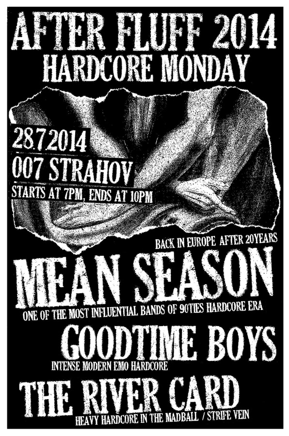 Jak už si někteří z Vás možná všimli, letošní tradiční After-Fluff na strahovské sedmičce bude trošku jiný než v předchozích letech... jde totiž o jediný evropský klubový koncert jedné z nejzásadnějších kapel hardcore éry devadesátých let. MEAN SEASON se po dvaceti letech vrací na stejné podium kde v roce 1994 vystoupili spolu s NO FOR AN ANSWER. tentokrát jim budou sekundovat britští GOODTIME BOYS a THE RIVER CARD.