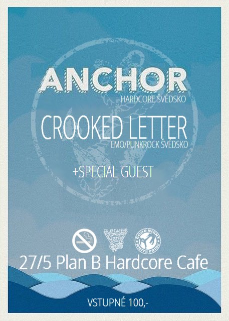 Anchor jsou švédská hardcorepunková kapela, která vznikla v roce 2007, za tu dobu stihli objet 5 kontinentů a 450 koncertů ve 40 zemích a to na turné s takovýmy jmény jako Verse, Trial, Judge nebo Defeater, hrajou melodický hardcore ve střihu 90tých let se sociálně politickými texty a animal liberation tématikou. Na turné si s sebou vezou švédské krajany Crooked Letter, kteří hrajou emo/punk, který v 90tých letech hrály kapely jako Samiam nebo Texas Is The Reason a dneska např. Title Fight, Wonder Years, Citizen apod.