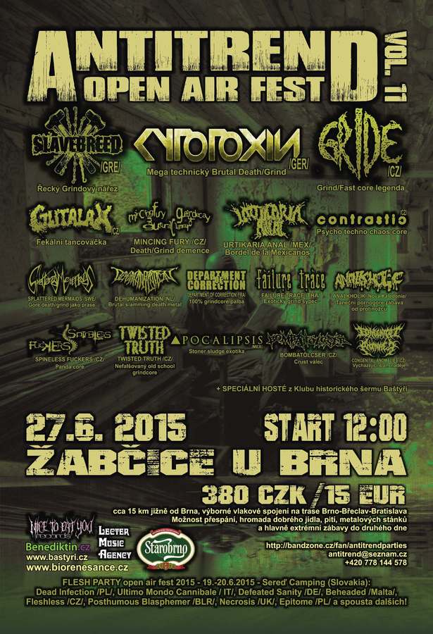 Poslední červnovou sobotu, tedy 27.6. se uskuteční již 11. ročník dnes již prakticky kultovního Antitrend Open Air festivalu. Festival se jako (až na jedinou výjimku) každý rok koná v příjemném prostředí vesničky Žabčice, která se nachází kousíček od jihomoravské metropole Brna – navíc v luxusní vzdálenosti zdejší vlakové zastávky (vlaky sem jezdí každou hodinu). Pokud Vám v žilách koluje láska k hudebním stylům jako je death/grind, brutal death, gore grind či crust, je sestava letošního ročníku tohoto extrémního festivalu pro vás jako stvořená. Pravděpodobně zatím nejsilnější sestava čítá hned 17 kapel z 9 různých světových zemí a ani letos nebude chybět několik opravdových exotik! Každý správný fanoušek výše uvedených stylových škatulek si tak určitě vyberu tu, za kterou se vydá cca 20km jižně od Brna, kde se rozezní ta nejšílenější zvěrstva, co může extrémní scéna nabídnout.