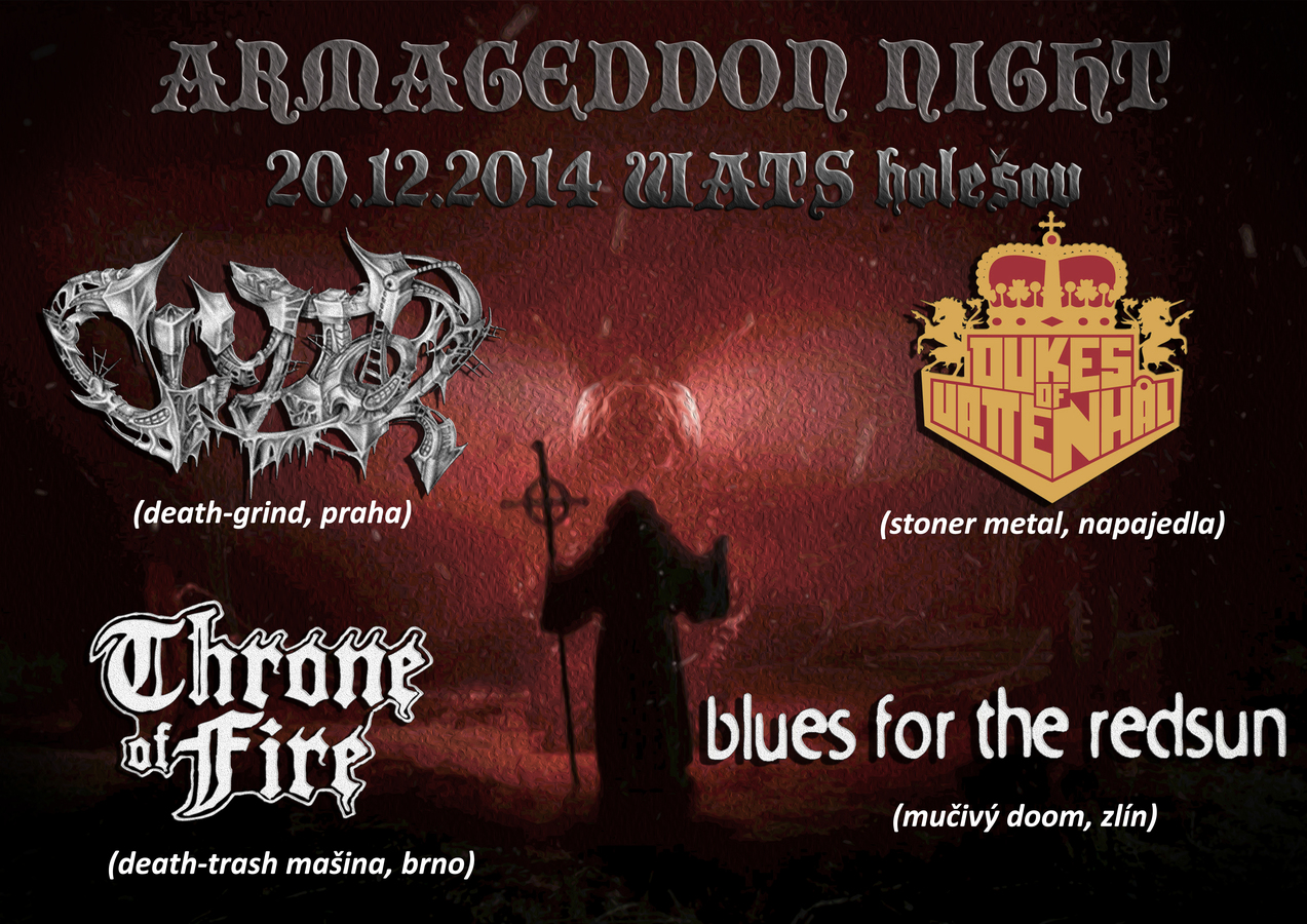 CLYTOR-death grind sekera(Praha),BLUES FOR THE RED SUN-stoner doom kladivo(Zlín),DUKES OF VATTENHAL-stoner metal rozbuska(Napajedla),THRONE OF FIRE-death thrash zbíjecka(Brno)
