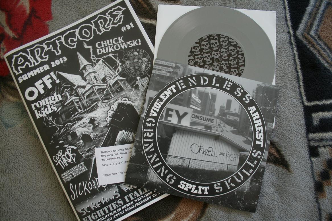Zpráva od “UK spojky” Ondry (Dead Heroes): ARTCORE issue * 31 + VIOLENT ARREST / ENDLESS GRINNING SKULLS split 7"EP - Hned několik UK hardcore/punk legend se sešlo při tomto už 31.čísle Artcore zinu, kterej vychází neuvěřiitelných skoro 30let. Velkej respect patří týpkovi, kterej se za timto veledílem skrýva. Tím je Welly, majitel Ghost City shopu v Cardiffu {ex Damaged records} a frontmanovi punkových Four letter Word. Mezi ty dalsi legendy bych s klidným srdcem zařadil členy obou kapel na split 7"EP desce, ktera je součástí novýho čísla. K Violent Arrest stačí zmínit jen slovo Ripcord, kapela ve které členové V.A. působili dlouhá léta. No a Endless Grinning Skulls ti zase učinkovali/ji ve spolcích jako Heresy, Geriatric Unit, Hard to Swallow, Army of the Flying Robots, Dead in the Woods a milionech dalších kapel. Už několik předešlých čísel Artcoru vyšlo s bonusem vinylové desky, ale todle je mně asi nejblizsi. Violent Arrest - poctiví přímočaří punkáči částečně ovlivnění oi, vydávající na Deranged records/Grave Mistake. Jejich strana tohoto šedýho vinylu obsahuje dva songy "Sharp Knife, Short life" a "Shattered" s texty, ktery mi nahánejí husí kůži. Endless Grinning Skulls z Nottinghamu přicházejí s jednou working-class skladbou "Jackal". Kapela mixuje vlivy starýho Švédska, Anglii, Japonska, ale i Rudimentary Peni, Crucifix nebo Siege. V každým případě super split deska, která dává tomuto legendarnímu zinu další dimenzi. No a co říct k zinu? Klasická grafika a typickej format A4 {todle cislo se 40 stranama}, obsah tradičně nadpruměrný rozhovory s Yhteiskunnan Ystavat?, Endless Grinning Skulls, Conquest for Death, Chuck Dukowski {Black Flag/SST records}, OFF!, Rough Kids + obsahlý info o Italský scéně 80tých let, recenze a mnoho dalšího. Svoji kopii si můšes zabookovat u deadheroes.cz, desky jsou na cestě do ČR. Nebo si zine objednej přímo u Wellyho. Více na artcorefanzine.bigcartel.com nebo artcorefanzine.co.uk.