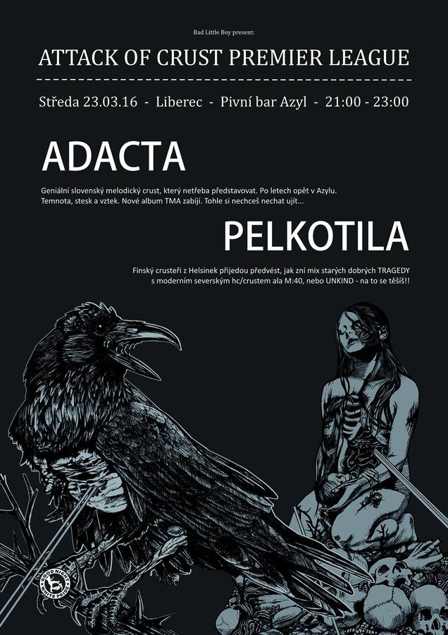 Další březnová hudební legrácka pod taktovkou Bad Littele Boy bude zaměřena na havrany, černokněžníky, špinavce a ztetovaný, dredatý, opierciengovaný zrůdy. Všichni chřestivý crustýši pozor! ADACTA (SK) Slovenská královna na poli moderního melodického crustu táhne na válečnou výpravu do skandinávie a po cestě se chce rozcvičit na severočeších. Kdo byl před lety na koncertě (který se odehrál ještě na hospodě) ví, že ADACTA diktuje. Kdo nebyl, bude se ve středu moci přijít přesvědčit. ADACTA minulý rok zasekla svůj čtvrtý zářez na pažbu. Jmenuje se TMA, je k němu nádherný artwork a je to prozatím nejlepší nahrávka kapely. Temná, teskná, vzteklá. Možná nejlepší nahrávka minulého roku… Čekuj to: https://adactaband.bandcamp.com/album/tma PELKOTILA (FIN) Jedna kapela míří na sever, druhá z něj zase přijíždí. Ikonami moderního crustu inspirovaní punkáči pochází až z dalekých Hellsinek. V muzice finů se sice potkávají starý dorbý TRAGEDY a FROM ASHES RISE, kapelní sound ale nezapře ani poctivý skandinávský HC/crust. Je na co se těšit! https://www.youtube.com/watch?v=_EPMjX9HDSE