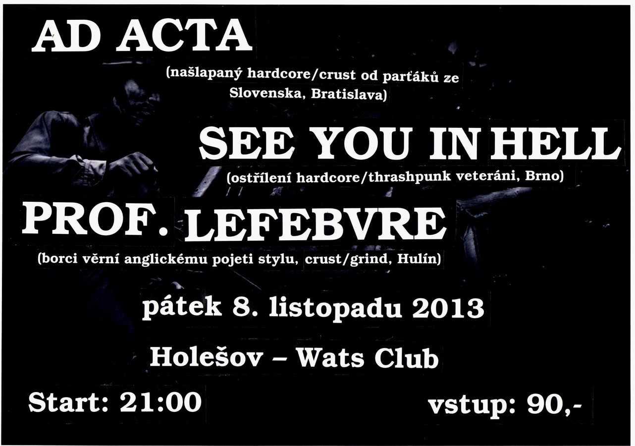 Ad Acta (hardcore/crust Bratiskava) See You In Hell (hardcore/punk, Brno) Profesor Lefebvre (crust/grind, Hulín)