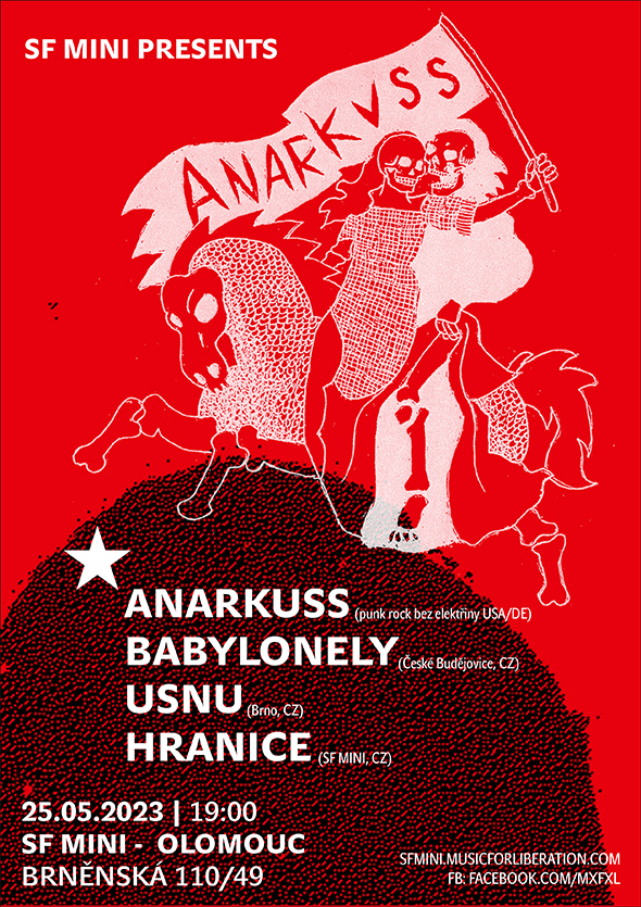 ANARKUSS - akustické duo, punkrockové písničky v podání Anne Hübschmann a Al Burian (Milemarker, Challenger). Milemarker (pro mnohé zásadní kapela) jsme mohli vidět před lety v Olomouci ve starém Divadle Na Cucky a byl to nezapomenutelný koncert.