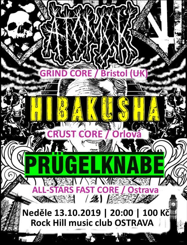 Rok se s rokem sešel a bristolští grind core matadoři ATOMÇK opět zavítají do Ostravy za domácí podpory all-stars úderky PRÜGELKNABE a přespolních HIBAKUSHA. Bude mela tak dovalte v hojném počtu. Krátké, rychlé a hlasité sety kapel zajištěny. Plus volume doprava jako nesmrtelní Spinal Tap!!!