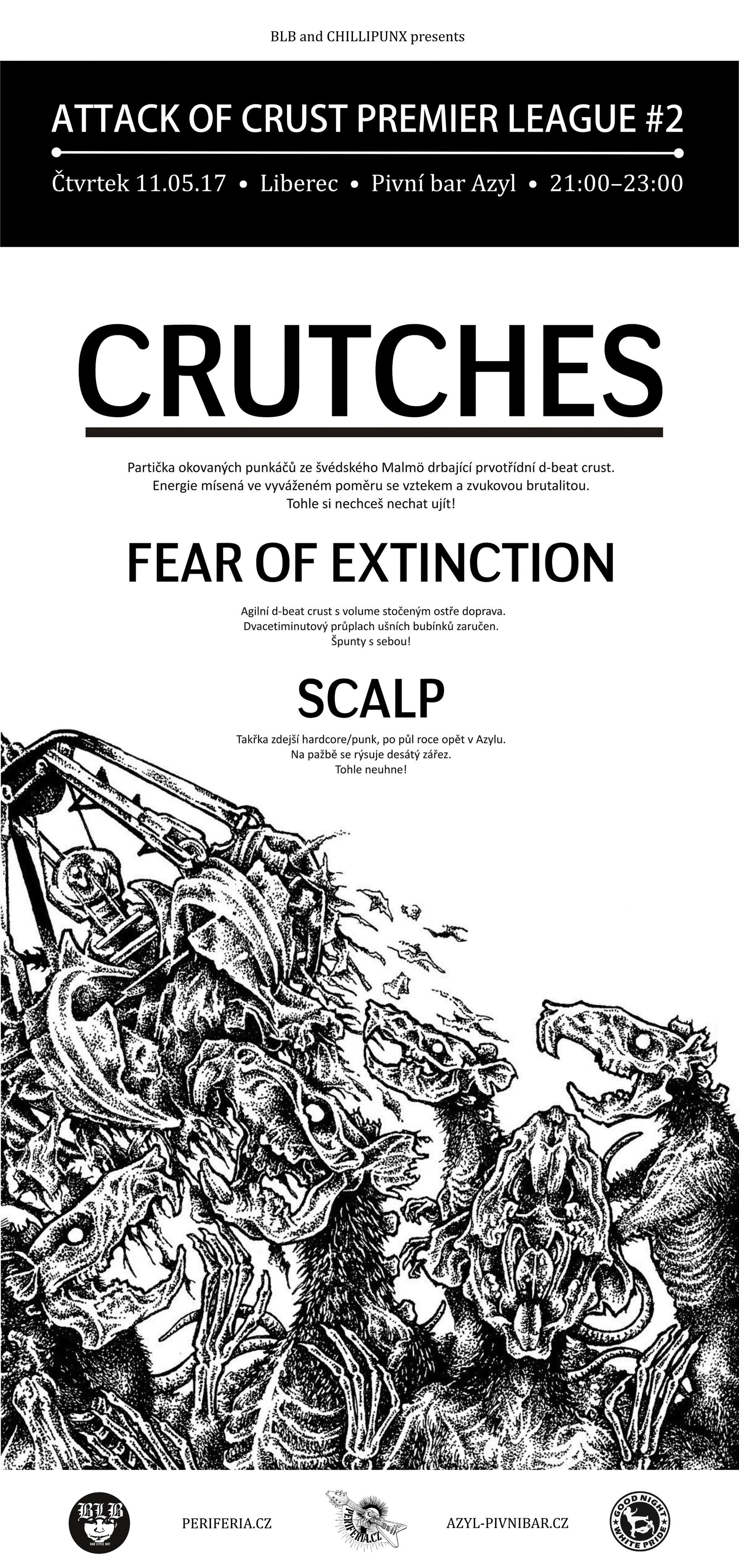 CRUTCHES Téměř přesně před rokem se tito okovaní crustýši ze švédského Malmö postarali o skutečně velkolepou show na fesťáku v Modrý Vopici. Lezlo se po stropě a plavalo na rukách a nejen kapela byla jak urvaná ze řetězu. Letos míří na místo činu Crutches znovu, ale ještě před tím než podruhé roztřískají Vopici, přijedou si udělat menší opičku do Libereckého Azylu. Je na co se těšit! https://www.facebook.com/crutches666/?fref=ts https://crutches666.bandcamp.com/