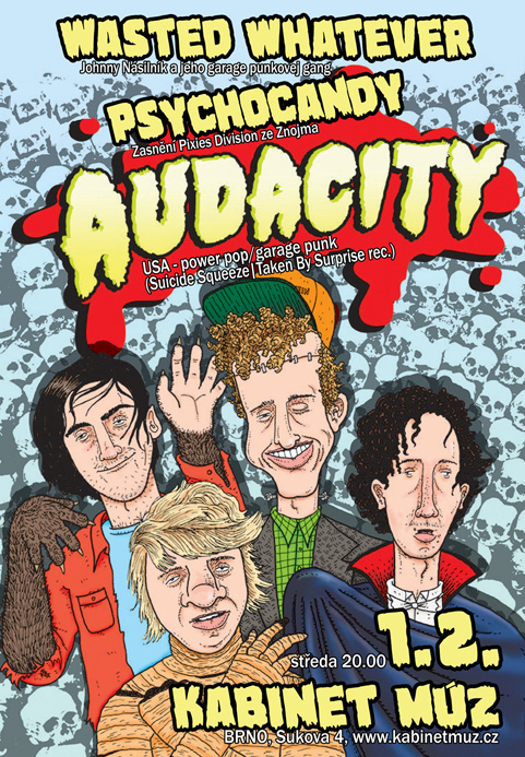 AUDACITY / USA / Power pop punkoví spratci z města Fullerton letos vydali svojí čtvrtou velkou studiovou desku s názvem Hyper Vessels na repektovaném labelu Suicide Squeeze ( Modest Mouse, Russian Circless, Minus The Bear, This Will Destroy You ) a definitivně tak potvrzují svoji příslušnost k tomu nejlepšímu, co daný žánr v současnosti nabízí. Punk as Fuck, kterej Tě vykopne až do jundrovský obory, kde při Tvým dopadu zařičí muflon v říji a ze zamrzlé země radostí vyskočí fialky. První koncert Audacity v ČSSR…
