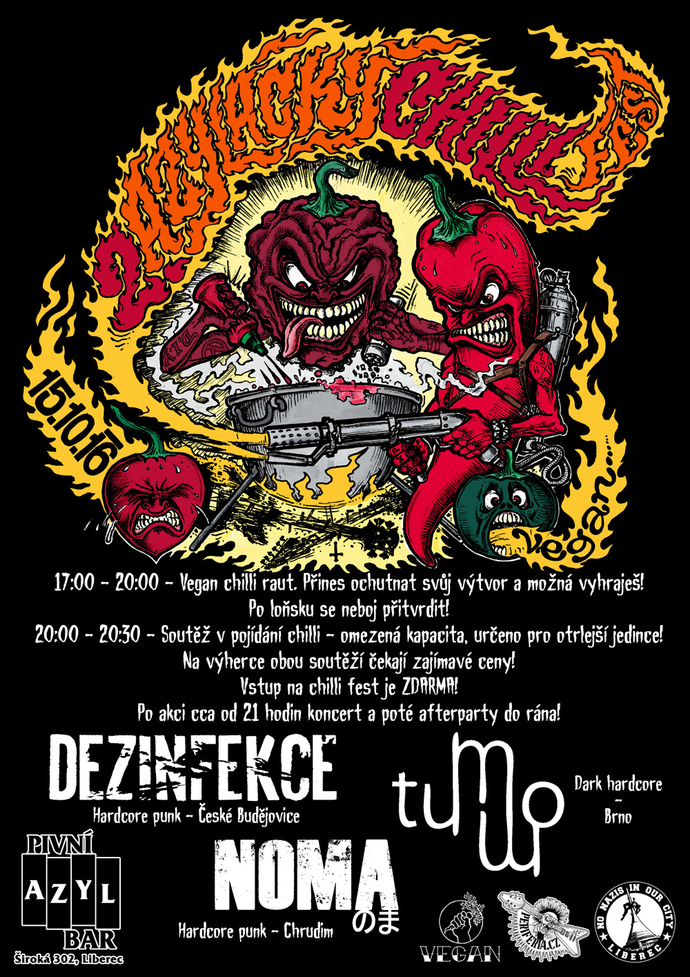V sobotu 15. 10. 2016 proběhne v Pivním baru Azyl druhý ročník úspěšného Azyláckého Chilli festu. Od 17 hodin začne Chilli fest rautem, kterého se každý může zúčastnit se svými kulinářskými výtvory. Můžete uvařit cokoliv, pokud to splní 2 podmínky: jídlo musí být 100% veganské a musí obsahovat alespoň trochu chilli (po prvním ročníku je ale myslím na čase přitvrdit). V rámci Chilli festu také proběhne soutěž o nejlepší pokrm. Pokrmy budou označeny podle (subjektivní) pálivosti, takže vybrat si bude moci beze strachu opravdu každý. Poté proběhne soutěž v pojídání chilli – ta bude mít omezenou kapacitu a bude určena spíše pro otrlejší jedince. Na výherce obou soutěží čekají zajímavé ceny! A protože se akce odehrává v pivním baru, čeká Vás na místě i pivní překvapení!