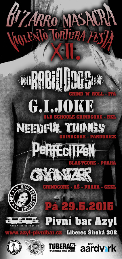 Již po dvanácté se uskuteční setkání příznivců nekompromisního grindcoru, tradičně v Libereckém Azylu. Vracíme se po roce, jsme plni elánu a zdrcující energie. Zatímco poslední ročníky byly nařachané hvězdnýma grupama, co do kvantity slabší (pokaždé jedna zahraniční star a dvě domácí bandy), tentokrát to do vás nekompromisně namlátíme totálně, jak se říká - na hulváta! Pět grup a všechny top! Dvě zahraniční pecky, tři domácí grindové mašinérie. Hojnost a maskrálnost, toť heslo tohoto Bizárra! Představme si kapely: RABID DOGS - GRINDCORE - ITA - http://rabiddogs.bandcamp.com/ Italskej dobře známej grindcore-metal-špinavej punk a nevímco ještě. Letos si je před OEFem můžete zhlédout při klubovým koncíku. No a kde jinde než v Azylu? Tohle si nemůžeš nechat ujít! Vše v atmošce Spaghetti western! G. I. JOKE - OLD SCHOOLE GRINDCORE - BEL Relativně mladá belgická grupa, hrající špinavej oldschoole grind. Za bicíma nečekejte nikhoo jiného než starého známeho Nilse z Agathocles! Tihle kluci nám přivezou něco jiného než belgické pralinky! NEEDFULL THINGS - GRINDCORE http://needfulthings.cz/ Pardubický našlapaný grindcore, nekompromisnost a surovost už od roku 95! Měl jsem tu čest je vidět už na hodně skvělých akcích, a nikdy nezklamali. Konečně v Liberci!!! ONANIZER - GRINDCORE http://bandzone.cz/onanizer Kapela objela podstanou část planety na svých neuvěřitelných gridndových tour po evropě, jižní americe, asii či austrálii. Novým bubeníkem se stal Nils z Agátek, tudíž nemáme moc příležitost tyto švarné chlapce uzřít, proto neváhejte! PERFECITIZEN - BLASTCORE http://perfecitizen.bandcamp.com/ Kapela vznilá po smrti dobře známé grindovky Alienation Mental. Masakrální technický death, totiž blastcore, vás rozhodně rozdrtí!