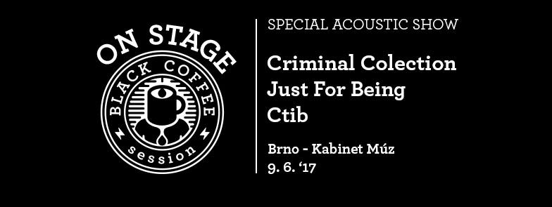 Kabinet Múz bude mít tu čest hostit velmi vyjímečný večer. V rámci Black Coffee Session zde odehrají své speciální akustické sety Just For Being, Criminal Colection , Ctib z Telefonu a očekávat můžete i minimálně jedno překvapení. Kromě samotného koncertu se můžete těšit také na netradiční uspořádání i výzdobu kabinetního sálu v podobě květin, svíček a umístění podia. Jestli jste vždy hltali MTV unplugged sessions, máte jedinečnou příležitost zažít něco podobně neopakovatelného.