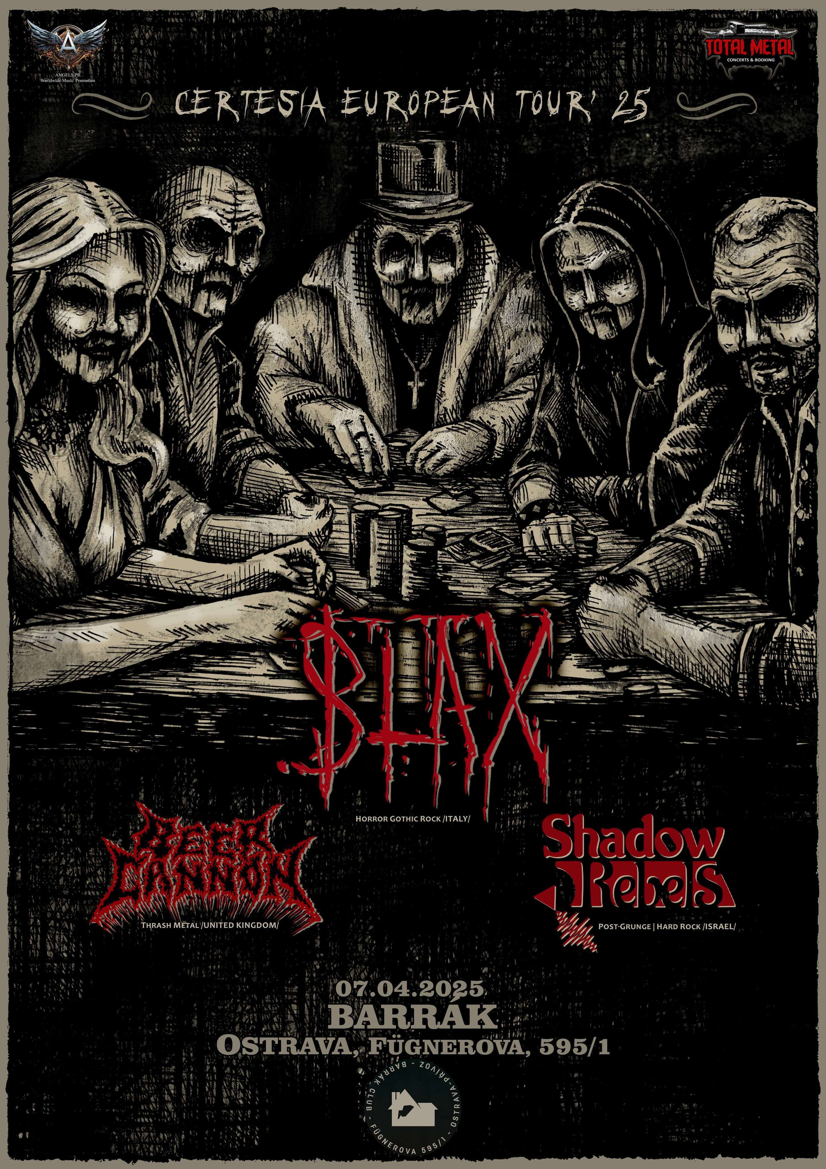 Horror gothic rocková kapela Blax přijede na malou scénu Barráku. Doprovodí je thrash metal Beer Cannon z Velké Británie a post grunge Shadow Rebels z Izraele.