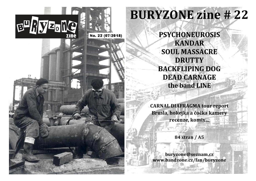 Po dlouhých třech letech vyšlo v polovině července 22. číslo BURYZONE zine. To obsahuje na 84 stranách formátu A5 rozhovory s kapelami: KANDAR, DRUTTY, SOUL MASSACRE, DEADCARNAGE, PSYCHONEUROSIS (Polsko), BACKFLIPING DOG a The Band LINE. K tomu navíc tour report CARNAL DIAFRAGMA nejen po Bělorusku, recenze na tiskoviny i nahrávky, komiks a článek "Brusla, hokejka a čočka kamery". Kontakt: buryzone(a)seznam.cz