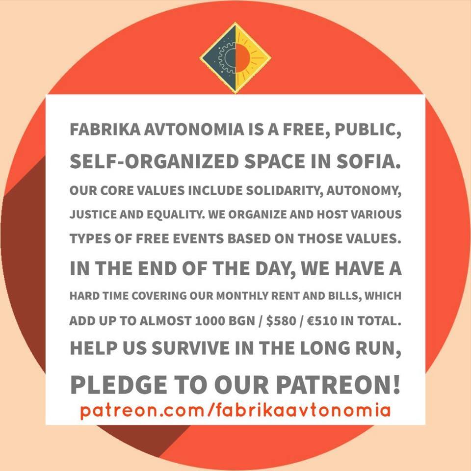 Fabrika Avtonomia je kulturní samosprávný prostor v bulharské Sofii, který je založený na myšlenkách solidarity a anti-autoritářství. V současné době je pomalu jediným místem v bulharském hlavním městě, kde se dají pořádat DIY koncerty a akce experimentálnějšího ražení, nemluvě o rovnostářských politických aktivitách. Prostor se v současné době potýká s vážnými finančními problémy. Další info v angličtině zde: