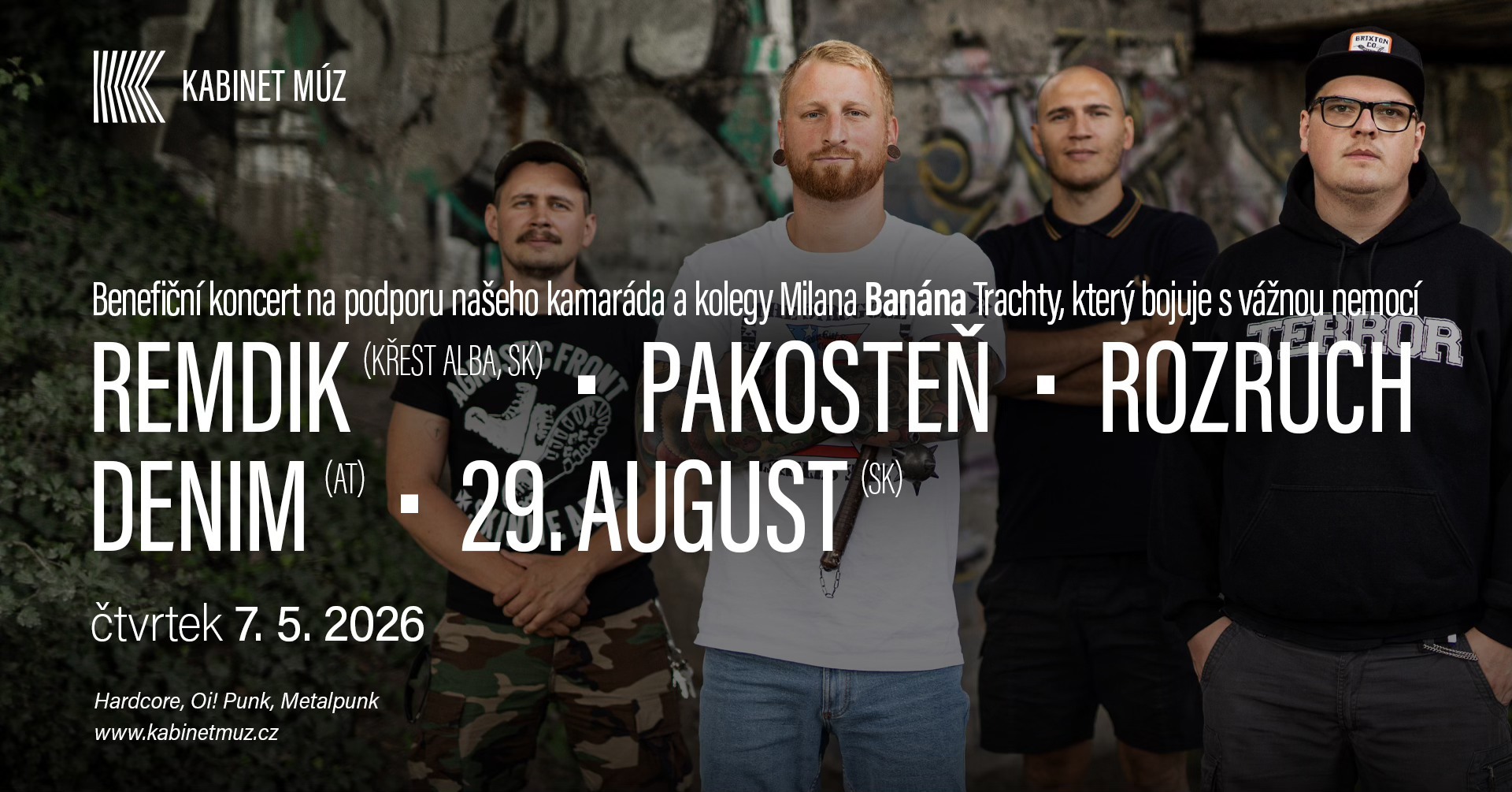👉 Rozhodli jsme se tento koncert uspořádat jako benefiční na podporu našeho kamaráda a kolegy Milana Banána Trachty, který bojuje s vážnou nemocí.