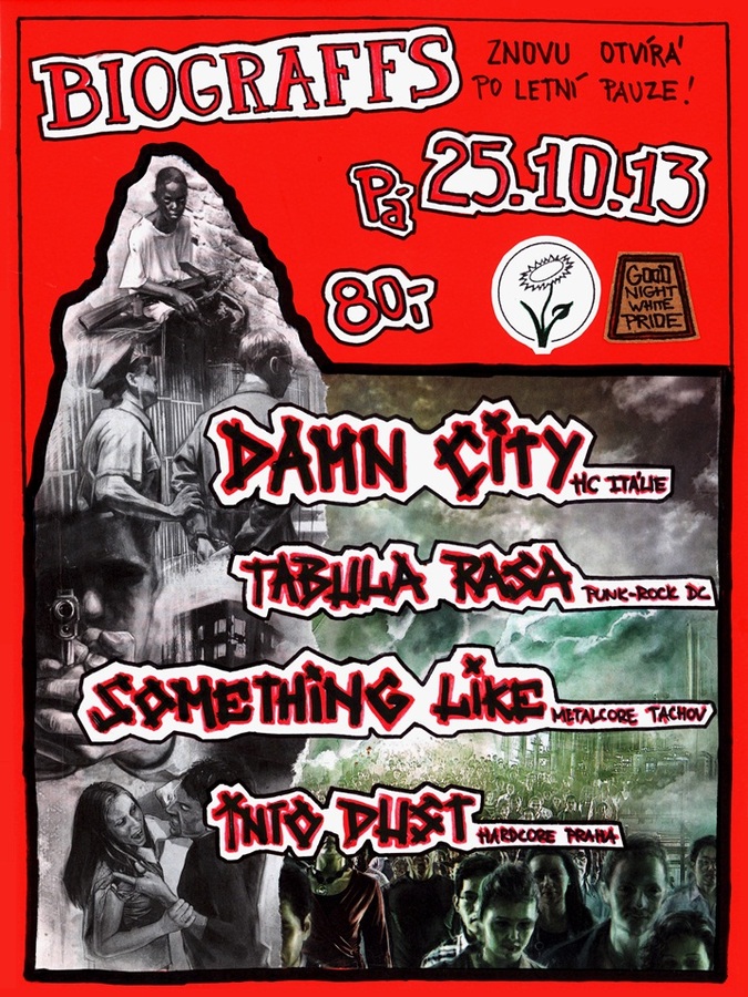 DAMN CITY - HC Itálie SOMENTHING LIKE - metalcore Tachov INTO DUST - HC Praha TABULA RASA - punk-rock Děčín V klubu bude vegan bufet