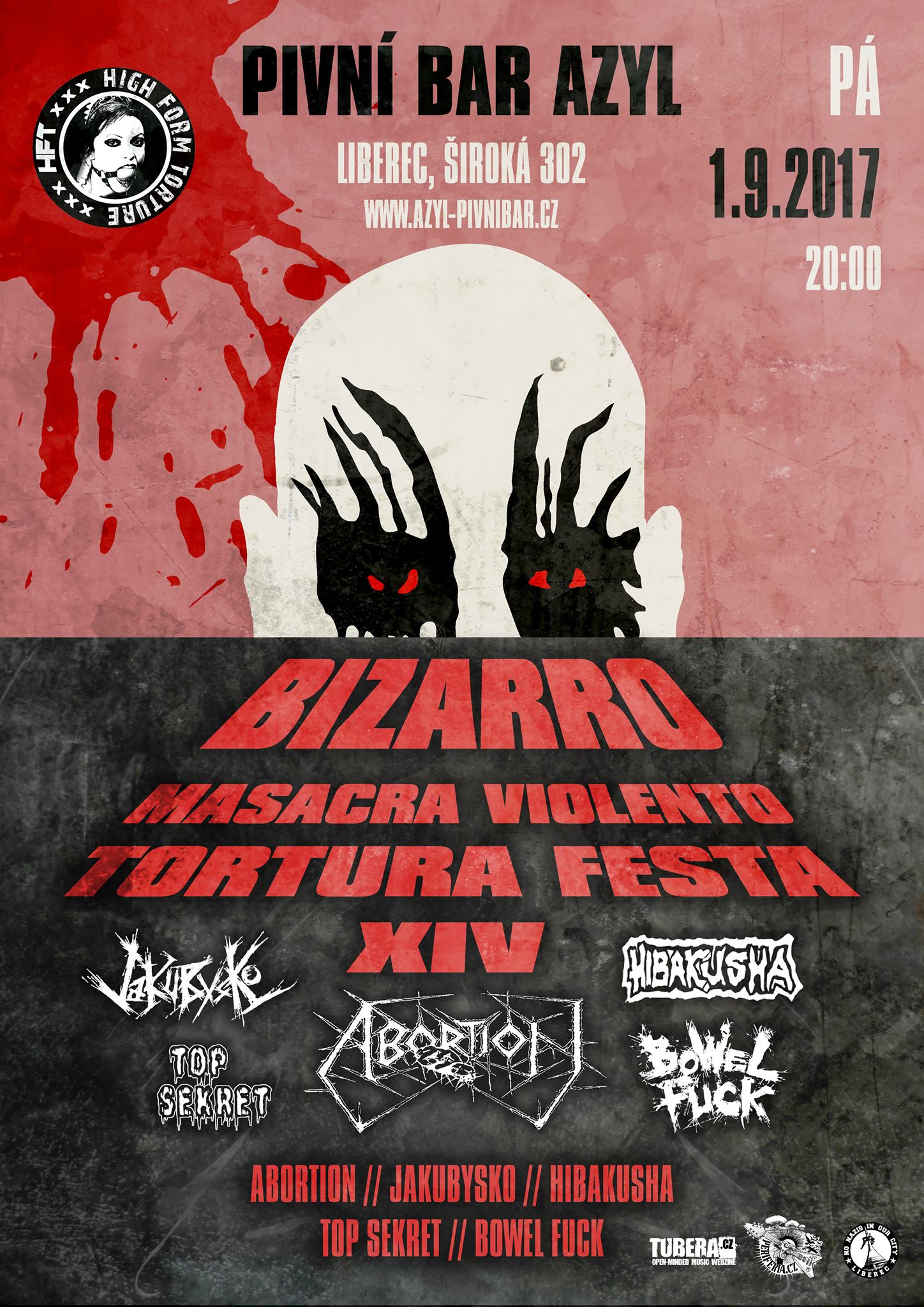 Nastává podzim, listí kvičí na stromech své poslední modlitby a s umanitostí kamikadze se vrhá k asfaltové dlažbě. Nastává podzim a téměř po roce je tu čas na další šílenej grindovej večírek v Libereckém Azylu. Další Bizarro, číslo 14, tentokráte jsme se vykašlalali na nějaké experimentování s deathcorem a hardcorem, máme tu jen nekompromisní, studenej, maniakální, vražednej a jedovatej grind!!! Grindcore, crustgrind, powerviolence a jako takovou schnilou třešničku navíc, patologickej goregrind ze severní Moravy. Doslova legendární kapely, vždyť Abortion slaví 20 let od vydání prvního alba. Hibakusha také oslavila dvacítku let své existence. Jakubysko a Top Sekret stojí na olezlích a opocených prknech přes deset let. No a BowelFuck sice deset let nehrají, ale všechny tři muzikanty si můžeme pamatovat z nějrůznějších legendárních českých uskupní jako Destructive Explosion of Anal Garland, Decomposive Manure či Choked by own Vomit. Kromě veselé a skočné muziky se můžete těšit na standartní bizarní procesy. Kvalitní a různorodá nabídka piv z českých minipivovarů, veganské pohoštění a kalení do ranních hodin. A o hřebíky v uších se postará zvukař Disscent! Tak co, dáme si panáka na báru? High Form Torture presents: BIZARRO MASACRA VIOLENTO TORTURA FESTA 14 ABORTION acid grindcore Nitra (SK) https://abortionofficial.bandcamp.com/ JAKUBYSKO power violence Zvolen (SK) https://jakubysko.bandcamp.com/ HIBAKUSHA crust grind Orlová https://hibakusha.bandcamp.com/ TOP SEKRET gore grind Nový Jíčín http://bandzone.cz/topsekret BOWEL FUCK grindcore Praha http://bandzone.cz/bowelfuck