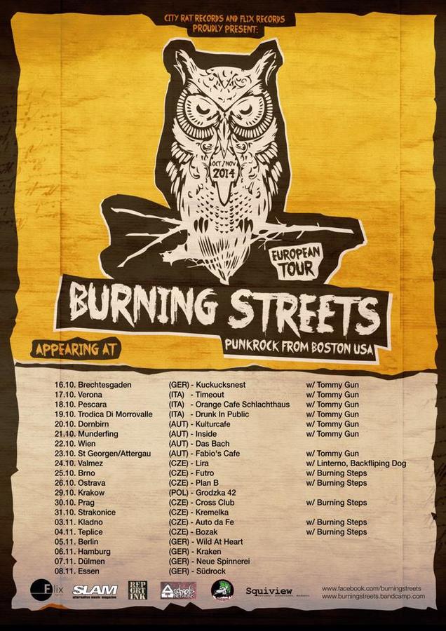 Burning Streets třeba nejsou tak známí a nemají tolik fans po celém světě, ale kdo se trochu o muziku zajímá, minimálně o nich slyšel, a nebo když na ně přijde řeč, alespoň dělá že ano a večer si je doma vygooglí a už je jasný. Burning Streets totiž hrají přesně ten typ hudby, co prostě nenechá klidným jak zaryté hardcoráře, tak ani pravověrné punx s čírem od piva. Vyrazit do města se sluchátkama na uších a poslouchat jejich muziku, jooo to je veget.Jinak Burning Streets se zformovali někdy koncem roku 2007, stačili vydat dvě alba. Ovlivněni kapelama jako Bouncing Souls nebo Hot Water Music vydali debutové album v roce 2009 nesoucí název "IS IT IN BLACK AND WHITE? " a druhé z roku 2011 se jmenuje "SIT STILL". Vysoce energický punkrock, podiové nasazení jak to prostě už amíci uměj a salva melodií a spojených vokálů!