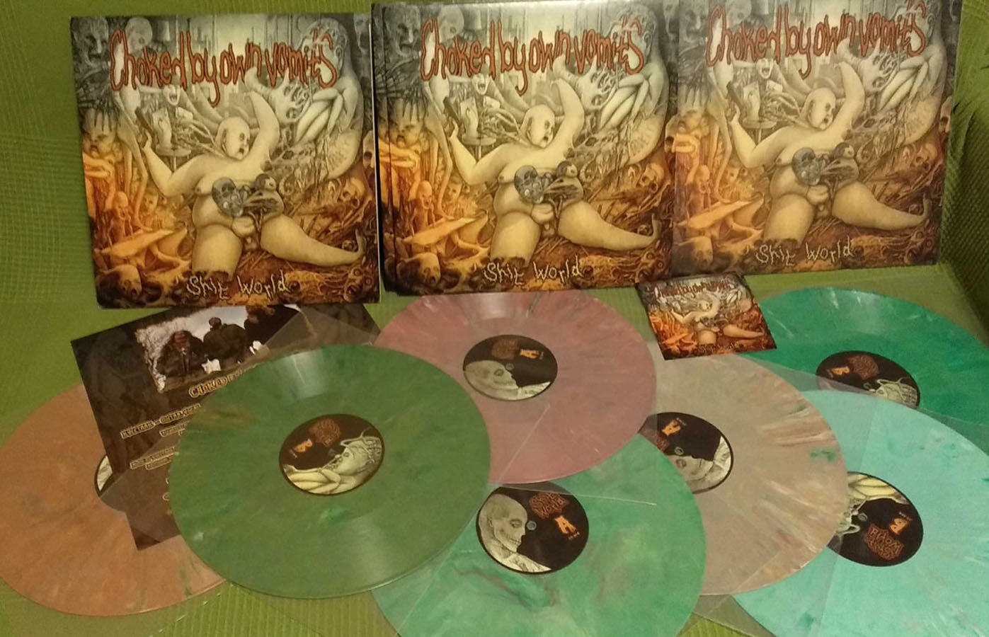 Nedávno vyšel první vinylový zářez domácích CHOKED BY OWN VOMITS.  Konkrétně druhé album SHIT WORLD. Deska vyšla ve spolupráci labelů ze Španělska, Německa, Čech a Slovenska. Jedná se o speciální barevnou edici. V případě zájmu piš na kvetak.chov@seznam.cz / Poslech možný na https://chokedbyownvomits.bandcamp.com