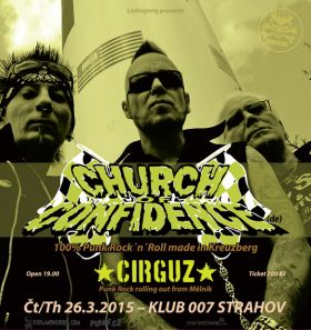Berlín. Věčně bublající kotel denního i nočního života, alkoholu, subkultur, muziky, kebabů, šlapek, hazardu, lesku i bídy... Co se punk rocku týče, jestli chcete tu pravou esenci tepající metropole, nemůžete to být nikdo jiný, než veteráni z Kreuzbergu - Church Of Confidence. Jedni z prvních, kdo bez skrupulí naroubovali melodickej rock´n´roll do syrovýho 77´punku. Od roku 1995 až do dneška se hrdě drží svýho kopyta a nehodlají ustoupit ani o krok. Wild At Heart punk rockers se řítí na Prahu a hodlají zahltit strahovskou Sedmič...ku pirátským punk´n´rollem až po okraj! Jako první pod kotel přiloží mělnický punk rockový komando - Cirguz!!