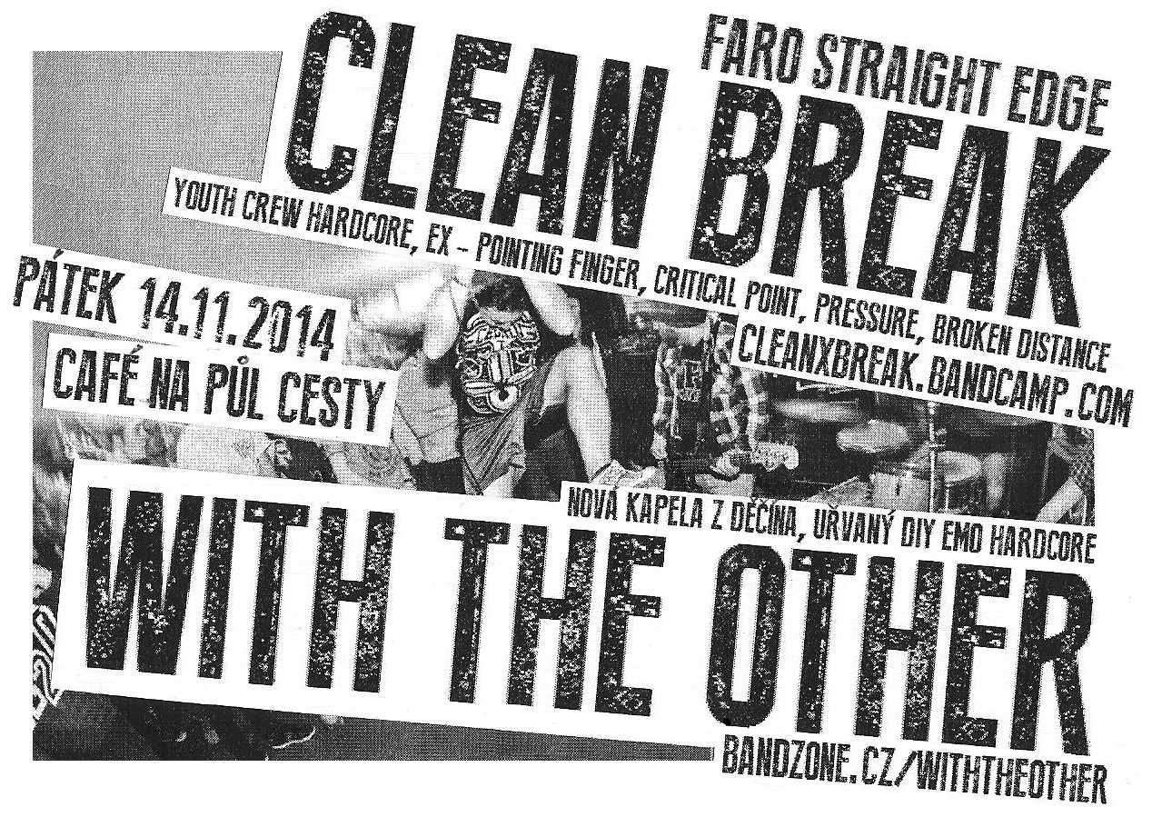 Clean Break jste v Praze mohli vidět už na jaře tohohle roku, kdy vystoupili na tomtéž místě spolu se znovuobnovenými Shut Up & Dance ze severočeskýho Děčína. tentokrát s nimi uvidíme v Praze poprvé zbrusu novou děčínskou kapelu With The Other, ve který mimojiné najdete dva členy SUAD a která hraje melodický, ukřičený a temný emo načichlý tím čemu se dneska někdy říká neocrust nebo emocrust. pro mě je to ale pořád především emo a hardcore a jsem hrozně rád že v Čechách vznikaj kromě macho kravin i takovýhle, lidský a sympatický kapely...
