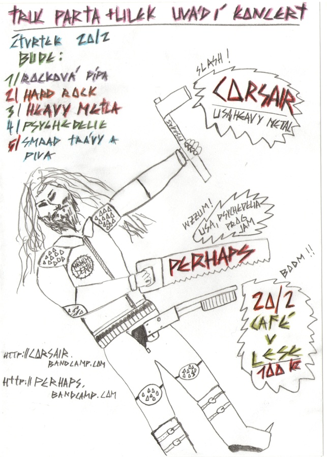 VSTUP: 100 - 200 Kč jak můžeš START: 19:45 ---- Snad přijedou i Korsáři ... Truc Parta a Lilek uvádí koncert CORSAIR (US, Shadow Kingdom) & PERHAPS (US, Origo) & THE TOWER (CZ, Praha - oldschool doom) Čtvrtek 20/2 – Café V Lese, Praha Tak dlouho se Lilek s Mikinem z Truc Party přehrabovali v moři lokálních kapel, z nichž žádná neměla zrovna ve čtvrtek 20. února volno, až museli na poslední chvíli šáhnout do repertoáru zámořského Bostonu. A kombinace to bude obzvláště vypečená. Čtveřice bostonských psychedelických rockerů (PERHAPS), jejichž jedinou mantrou je slovo JAM a která si svoje odbyla už jako předkapela Hawkwind (a v dubnu si je jako předkapelu na své turné pro změnu vybrali ACID MOTHERS TEMPLE), se na jednom pódiu sejde s kapelou, která zní jako srážka Thin Lizzy a Iron Maiden (CORSAIR). Kapela CORSAIR se dala dohromady v roce 2007 a to pouze za účelem zahrát na halloweenském večírku coby tribute Black Sabbath. Tahle kvarteto, které mimochodem dala dohromady kytaristka Marie, si ovšem natolik sedlo, že začalo psát vlastní songy, vydalo dvě EP a jednu velkou desku a ve čtvrtek 20. února zahraje v Praze. Ačkoliv už píšou vlastní songy, pořád jim v první řadě jde o to vzývat démony starého hard rocku a heavy metalu a dobře se bavit. Kluci z PERHAPS, kteří se ujmou role předkapely, jsou hotovým ztělesněním energetického mládí. Vznikli v roce 2011, vydali dvě desky, kolaborativní EP se členy Acid Mothers Temple, odjeli společné koncerty a jamy s Damo Suzukim z CAN, nespočet amerických turné a letos je na řadě poprvé Evropa. Kapela, která těží z odkazu progresivního rocku, psychedelie ale i post-rocku po vzoru 90's kapel z Thrill Jockey či Constellation se v Praze objeví i se zpěvákem, který je novým přírůstkem do doposud instrumentální sestavy! Koncert začně v 19:45, vstup bude skutečně lidovka – za cenu v rozmezí 100 – 200 Kč vás vpustíme dovnitř, ale už ne ven. Ve sklepě poteče pivo z Chotěboře, po koncertě bude diskotéka - pardon – rockotéka (neřkuli rocková pípa) a hlavně si všichni pořádně promaníme palici u muziky, kterou tak nějak podvědomě všichni dobře známe. http://www.skykrakken.com/music.html http://perhaps.bandcamp.com/ Café V Lese, Krymská 12, Praha 10 https://www.facebook.com/cafevlese