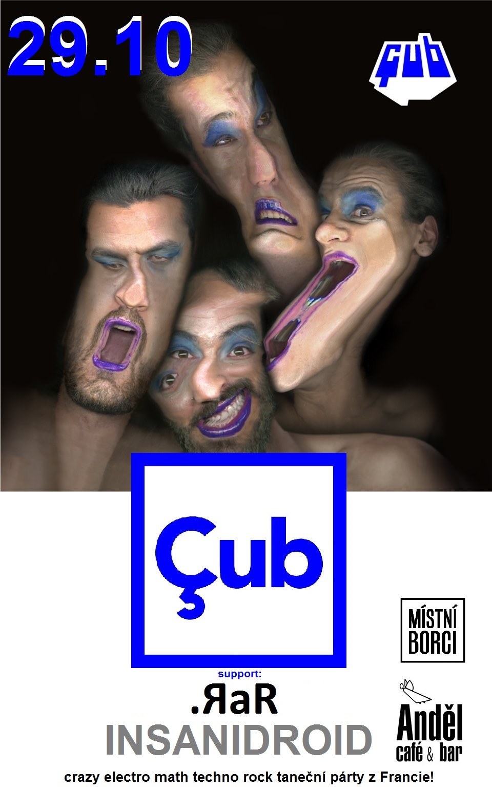 Çub je šílená electro math rock techno kapela z Francie. V jerjich hudbě je mnoho rozdílných vibrací a vlivů. Nikdo tomu nerozumí, ale všichni to milují! Ze zatuchlých garáží to během pár let dotáhli na velká festivalová pódia a navštívili například Německo, Portugalsko, Španělsko či Švýcarsko. Vůbec nevíme jak se jejich jméno kapely čte, páč nemáme v týmu žádnýho rodilýho či jinýho borce z Francie, ale rozhodně víme, že se bude tančit i po stropě!