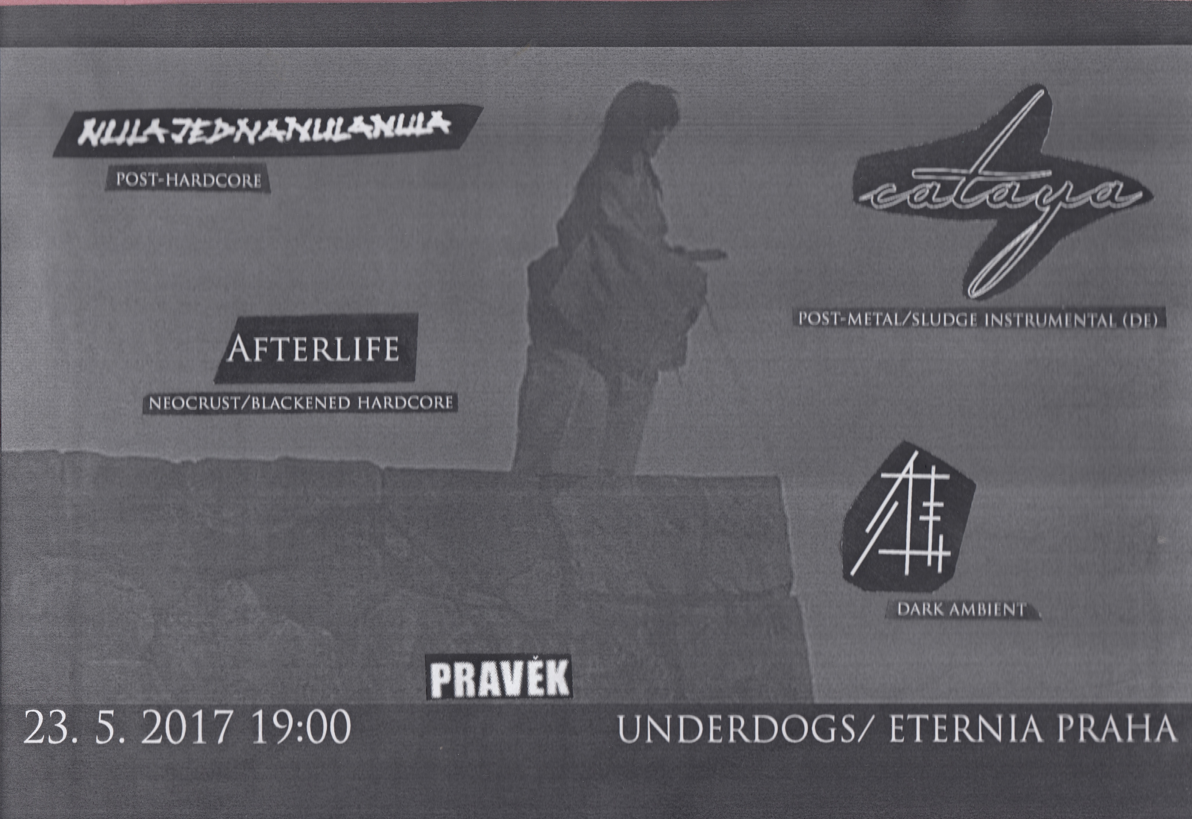 Valivá temnota by Pravěk Noise Section ve sklepních prostorách Underdogs vol.3, tentokrát míň vokálů, ale víc tremol: Cataya (instrumental post-metal/sludge, GER) https://cataya.bandcamp.com/ Neskutečná atmosferická nálož někde na pomezí post-metalu a bahna bez vokálů, kdo slyšel, jak podobné kapely zní v Underdogs, ten už tuší, že se vám tato sonická poezie zavrtá do nejhlubších koutů vašeho těla! Nulajednanulanula (post-hardcore emo screamo) https://nulajednanulanula.bandcamp.com/ Tahle kapela prostě nikdy neomrzí, atmosferické emo pasáže se střídají až s punkovým vyřvaným nasazením, navíc prý chystají novou desku! Afterlife (neocrust/blackened hardcore) https://afterlifepunk.bandcamp.com/releases Poměrně nový svěží vítr z temných pohřebišť v nejlepší tradici Fall of Efrafa či Tragedy, ale bez lezení do zadku trendům, prostě jasná volba jako support! Izanasz (dark ambient/drone) https://izanasz.bandcamp.com/ Ještě než se rozezní strunné nástroje, zahalí Izanasz prostor do antracitového oparu. 23.5. 2017 19:00 ...se vstupem už to znáte, jak vybíráme, takže klasika, férové stopáďo. http://praveknoisesection.blogspot.cz