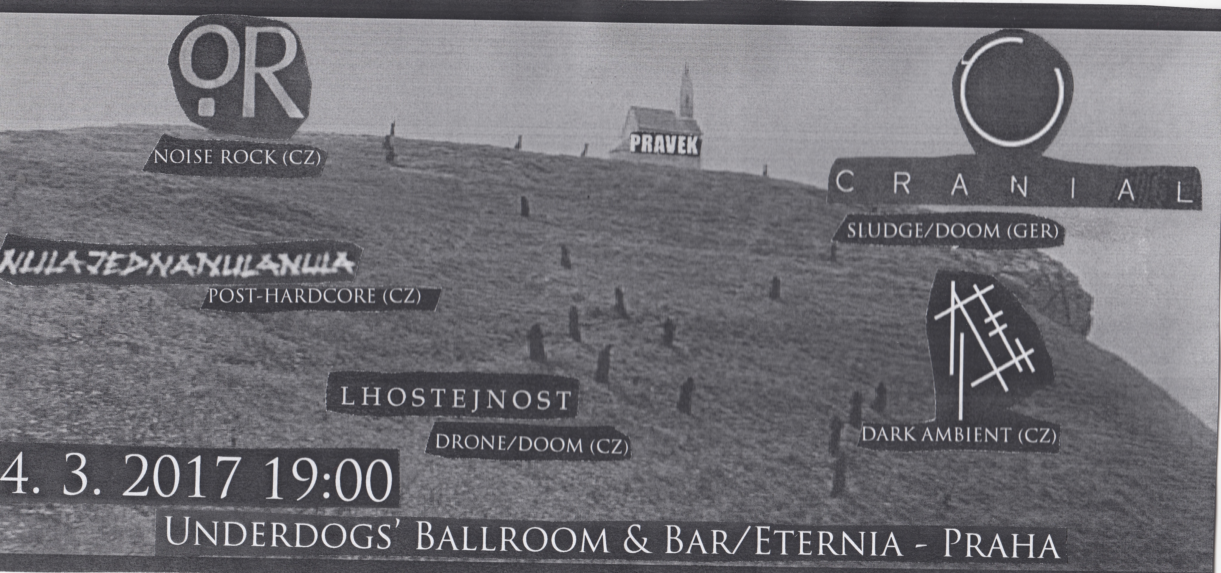 Pravěk Noise Section zavalí svět rozžhaveným dehtem opět v atmosférickém sklepení pražské Eternie alias Underdogs' Ballroom & Bar Cranial (ex-Omega Massif, GER) – promyšlené, ale valivé bahno pro fanoušky ISIS, Cult of Luna, Izah či Ortega! https://momentofcollapserecords.bandcamp.com/album/dead-ends Or - noise rock s příchutí zeleného oparu https://ornoise.wordpress.com/ Nulajednanulanula – post-hardcore, emo, screamo, ale hlavně nahlas! https://nulajednanulanula.bandcamp.com/ Izanasz – dark ambient pro snílky a poutníky bez cíle https://izanasz.bandcamp.com/ Lhostejnost – zvukové vyjádření beznadějné nehybnosti! https://lhostejnost.bandcamp.com/releases Vstup dobrovolný, ale fér cena tentokrát 150-250, cesťáky něco stojí, mějte to prosím na paměti! …play fast, funeral or motionless! http://praveknoisesection.blogspot.cz/