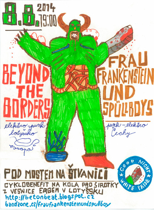 BTB sem dělal poprvý před čtyrma rokama v debilním Chapeu Rouge. Což byl asi nejhorší možnej prostor na to zkoušet jak by v praze fungovalo dobrovolný vstupný. Pohled na skupinky pěti lidí co u vstupu hodinu přemejšleli jestli mi maj dát dvacku za všechny byl k nezaplacení. Nicméně BTB se ukázali jako velmi příjemní lidé a to tohle slovo používám tak jednou za deset let, takže to už něco znamená. Párkrát sme se pak ještě viděli a dělal sem s nima rozhovor do Hlučálu a už poprvý povídali něco o tour na kolech. Tak jednou za půl roku sem si na to vzpomenul a zeptal se jak to vypadá, no a konečně sem se dočkal. Navíc je tohle tour benefiční na kola pro sirotky z vesnice Ergam v Lotyšsku. Vstup bude dobrovolnej, což neznamená žádnej. Ale to snad ani připomínat nemusim, nejsme přece koksáci z Chapeu, teda aspoň většinou. Spolu s BTB zahrajou ještě BOREDOM z Rakouska a FRAU FRANKENSTEIN UND SPÜLLBOYS.