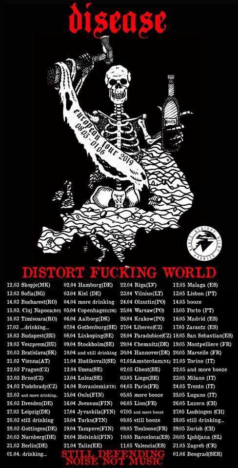 Dnešním dnem se rozhodli nařezat Evropu d-beat noise punkový DISEASE z Makedonie. Aktuálně mají venku split Lp s Earth Crust Displacement, které bude na turné k dostání, split vyšlo u labelu Black Against Night Records přestěhovaný do Austrálie. V rámci jejich extra dlouhého turné čítajících dva a půl měsíce navštíví svým hlučným punkem v duchu Disclose hned několika koncerty opět Českou Republiku. Nahrávka ze splitu je k poslechu na bandcampu kapely.