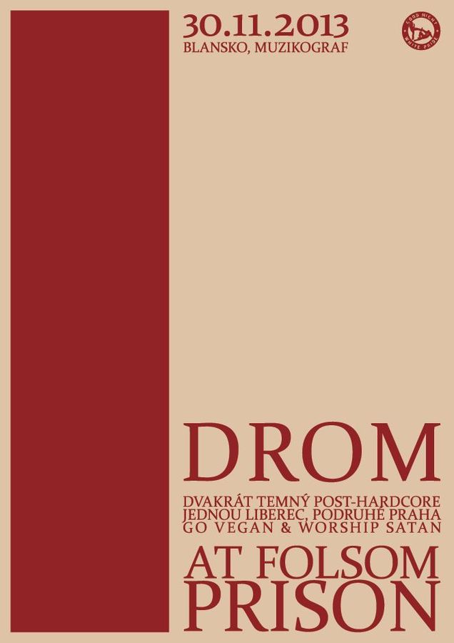 DROM je mord. A tomu věř. Temný post-metal na jasných hardcore základech. Kytarový stěny a tlak jako vášnivý pohlazení uvnitř srdeční komory. Vlivy Isis, Cult of Luna, Neurosis, a co bys ještě mohl znát, Russian Circles? No jasně. At Folsom Prison je pak pražská sebranka, která má krom Johnyho Cashe ráda taky Poison The Well, Refused, nebo Deftones a ucho našeptává, že belgická H8000 éra tu zanechala taky dost hlubokou rýhu.