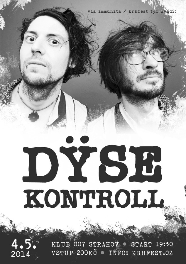 Není to nic proti nikomu, ale českej rybníček teď nemá žádnou lepší „two-piece band“. Bratři Holubové jsou neuvěřitelný, absolutně s ničim se v rámci tvorby nepatlaj. Kontroll jsou punk, muzika, ve který neni nic navíc, holá kost, holej Asfalt (2012). Kdyby neandrtálci chtěli dělat rockovou muziku, určitě by si na pomoc vzali basu a bicí, stejně jako Jožin a Vítek. Pro první květnovou neděli vsazíme na čísla dvě a sedm. 2 + 2 = Dÿse + Kontroll na Sedmičce. Dÿse a Kontroll, 4.5.2014 od 19:30, klub 007 Strahov www.dyse-band.de www.kontroll.cz