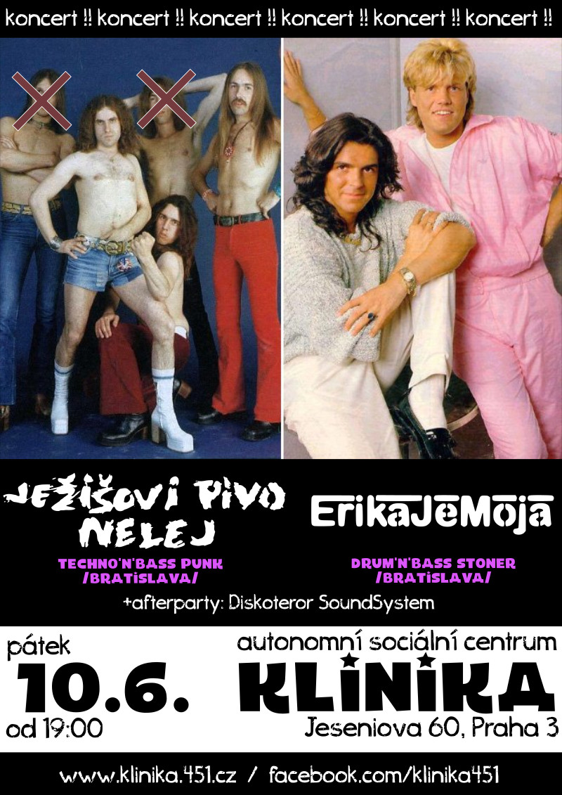JEŽIŠOVI PIVO NELEJ je drum'n'bass punková kapela, která za svou dlouholetou praxi nikdy v Praze nehrála v "opravdovém" klubu, vždy jenom v autonomních prostorách (Milada, Truhlařská, Zličín, Cibulka). Byla by blbost takhle hezkou tradici porušovat, takže se koncert na Klinice jeví jako naprosto logický krok. Navíc navážou na poslední koncert na Cibulce a opět si místo bubeníka přivezou sadu krutěpřísných beatů a ne-tak-úplně uchopitelnou videoprojekci. http://bandzone.cz/jezisovipivonelej Doprovázet je bude ERIKA JE MOJA, duo složené taktéž z basy a bicích, ovšem s tempem spíše hypnotickým než-li epileptickým. Nedávno spolu vydali desku, kterou vám na koncertě představí, ukážou a s trochou štěstí i prodají. http://bandzone.cz/erikajemoja O afterparty se postará DISKOTEROR SOUNDSYSTEM, trio nekompromisních selektorů, kteří z hlubin nedávné hudební historie vybrali snad ty nejhorší videoklipy a smíchali to do té nejlepší směsice disca a punku, která si podmaní i vás! https://www.facebook.com/DiskoterorSS/
