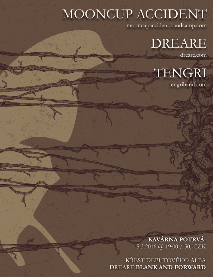 Po listopadových událostech, kdy vystupovali každý zvlášť, se v Potrvá opět objeví Tengri, Mooncup Accident a Dreare, kteří zde pokřtí své debutové LP. Tři různé interpretace vycházející ze stejné energie. Tags: chodník, vila, 347, branka, schody, číše, světla, milchstunden, projektor, protektor, instrumental, post, noise, metal, noise, kalíšky, housličky, bebíčka, shluk, teplo, 2x12, rauchenstunden, 2 číše, přestup, na, linky, S, S, a, další, vlakové, spoje tengriband.com mooncupaccident.bandcamp.com dreare.com