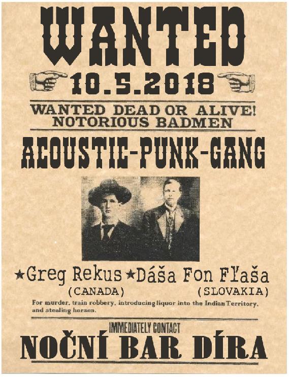 Dva desperáti na cestě. Zdá se, že jejich tour neberou konce. Akustický kytary neznamenaj umírací jámu, ale energii. L´énergie, c´est la vie, chápeš... Vkrade se nám sice trochu melancholie, ale rozhodně se nebude brečet! Co za punk tě čeká, se můžeš podivat třeba v DxFxFx videu Lost in Poland :-) Na svoje si přijdou folkáči, fankáči, pankáči, hardkoristi a aj granžeri! 10. května ve vašem oblíbenym baru nastavíme zrcadlo. Vstupný do klobouku. Ale nezapomínej, že i když to nejsou "regulerní" kapely, že kluci nepotřebujou na naftu... Díky!