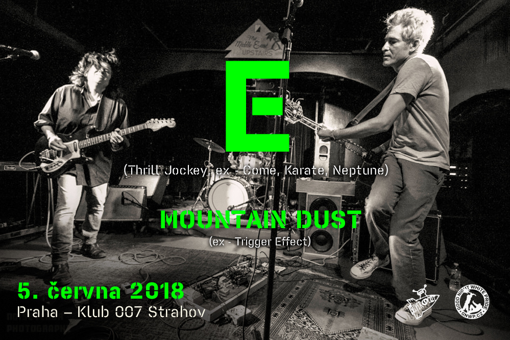 Zase jsme se rozhodli spojit radši dvě turné, než vás tahat na dva koncerty v rozmezí pár dnů. Vzniknul tak tenhle nádhernej gig: E (ex - Come, Karate, Neptune) nás naprosto nadchli už před rokem, kdy jeli turné s debutovou deskou na Thrill Jockey a na 007 předvedli parádní set. Druhý album „Negative Work“ vychází letos tamtéž a je LEPŠÍ. V kapele se sešli bubeník Gavin McCarthy z Karate, kultovní kytaristka z legendárních Come Thalia Zedek (dále např. ex – Uzi, Live Skull) a Jason Sanford z Neptune, kterej zvuk tria ozvlášťnuje vlastnoručně vyrobenou baso-kytarou. Těžko to nějak popsat, musí se to slyšet, ale funguje to skvěle a E mají i dík tomuhle nástroji zvláštní syrovou sevřenost a hypnotickou energii.