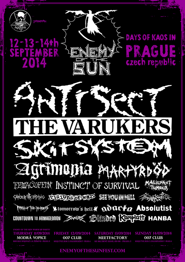 Hlavní sobotní program tentokrát hostí smíchovská Meetfactory, kde smršť započne s úderem půl čtvrté a s českými death metal punx March Of The Hordes. Jejich dvě split EP vydaná v posledním roce jsou slibné a ti, kdož si užívají různé variace na počátky skandinávského death metalu, si přijdou na své. Skandinávie po česku bude ovšem pokračovat i s další kapelou, tou jsou Tomorrow’s Hell, švédským d-taktem a potemnělostí inspirovaní pánové z Moravy. Jižní Evropu zastoupí Cancer Spreading, stenchcore po jižansku s několika zajímavými nahrávkami na svém kontě. Švédsko po moravsku tu už bylo, tak je možná čas na Japonsko na moravský způsob. Své sushi-knedlo-zelo předvedou See You In Hell, kteří se svou neúnavností dokopali mezi nejvýraznější a mezinárodně nejznámější kapely na tuzemské scéně, a navíc, poslední album je bez debat vážně povedená záležitost. Po brněnských Japoncích je na řadě ostravské motorheado-televarieté jménem Malignant Tumor které možná není potřeba zvlášť představovat, krom prostého konstatování - je to hudebně neuvěřitelně šplapající jízda a taškařice od začátku do konce. Přichází čas na autentické Švédsko a to hned v několika podobách. Tou první jsou Martyrdod, jejichž nahrávky plné mísení tvrdého d-beatu se sem tam death metalovým trikem, nakopávají zadky již nějaký ten pátek. Živě bývala tato kapela sázkou do loterie, někdy skvělá, jindy průšvih, o to spíš stojí za to je otestovat tentokrát, navíc u Southern Lord právě vydává své nové album. Následují Skitsystem, ti mají za sebou ještě delší kariéru než jejich předchůdci a živě bývají podobně nevyzpytatelní, možná to může být i momentálním obsahem různých látek kolující v krvi členů kapely. Ostatně jejich hláška „No Speed No Punk“ se již dávno změnila ve vlastním životem žijící okřídlenou klasiku. K tomu nutno přičíst, že na svém kontě mají pěkných pár ve svém stylu výborných nahrávek. Trojici švédských zástupců doplňují Agrimonia, utahaná, ponurá záležitost s notnou dávkou metalových vlivů pro fanoušky podobně laděných metalově potemnických záležitostí. Vrchol včera obstará dvojice veteránských záležitostí z Velké Británie - Varukers, jež mají za sebou příběh jdoucí až zpět na přelom sedmdesátých a osmdesátých let, s přehlídkou klasických nahrávek vydaných pod hlavičkou Riot City či Rot Records. Po svém návratu na pódia v devadesátých letech jsou pak jedni z nemnoha těch, kdož dokázali důstojně navázat na původní tvorbu a stále působit aktuálně. Anti Sect jsou pak z mrtvých vstanuvší legendou v pravém slova smyslu. V osmdesátých letech vydané jediné album „In Darkness..“ je zcela právem jedním ze základních stavebních kamenů crustu i stench core a kultovní peace punkovou deskou. Pozdější singl pak zaznamenal výrazné ovlivnění metalem, bohužel dříve než došlo na druhé Lp se kapela na dlouhá léta rozpadá, aby jako celkem svěží zombie vyšplhala z hrobu před několika lety a čas od času provětrala pódia punk festivalů. Neděle se přenese pro ty, kterým to ještě nestačilo, opět na Sedmičku. Program tam otevře místní Hlinomaz. Pokud toužíte po tom, seznat co to je hipsterský kravál po pražsku, tak tady máte jedinečnou možnost. Sludge či noise inprovizace, těžko říci, to by měl posoudit asi každý sám. Jako bonus v sestavě najdete figurky z nějakých místních, méně či více známých kapel. Následují kalifornští crusties Femacoffin, relativně nové jméno na scéně s ex členy Stormcrow v sestavě, servírující poctivý stenchcore klasického střihu. Na svižnější strunu zahrají brazilští Nuclear Frost, mísící v sobě ponurý d-beat crust s notnou dávkou tradičního brazilského hardcore punku, což je vždy chutná třešnička na hudebním dortu. Headliner nedělního programu je stále zahalen rouškou tajemství, takže se necháme překvapit, co přinesou následující týdny.