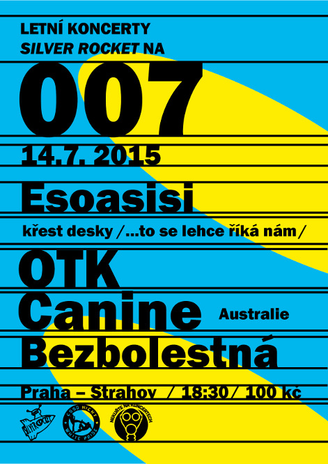 Součástí Silver Rocket programu letních koncertů Silver Rocket na 007 bude pražský křest desky „... to se lehce říká nám“ od ESOASISI se support od mládenců z OTK! No a aby toho nebylo málo… zhruba ve stejnou dobu potvrdili Hluch Crew koncert sympatických australských punkáčů CANINE a Bezbolestná, takže logicky jsme si říkali, že by bylo super to spojit, a podařilo se to! Výsledek je hotový festival syrovosti: raw šanson, raw prog rock, raw punk plus oceány raw piva na schodech, všechno za 100 korun v úterý14.července 2015 od 18.30! A proč Letní koncerty na 007? Slovo má ÚV SRR: „Koukáme takhle na program našeho oblíbenýho Klubu 007 na červenec a co nevidíme... JEDINEJ koncert! A to znamená pro Sedmičku nulovou šanci zaplatit za červenec nájem atd. No a protože atmosféru prázdninovejch akcí na 007 dlouhodobě milujeme, rozhodli jsme se udělat tuhle ´minisérii´. Pivo, pizza, kapely, vstup 100 Kč. ´Ambicí´ tohohle celýho je vypít něco na baru, kouknout na koncerty - a nenechávat tam nahoře Sedmičku přes léto tak samotnou.“