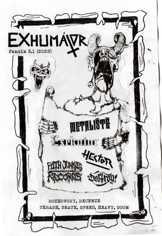 Koncem 80 let začal vycházet jeden z kultovních fanzinů, Metaliště. Pravidelně vycházející tiskovina byla plná pestrých novinek a zajímavostí z tuzemské i zahraniční scény. Milan Škoda, jeden ze zakládajících členů se rozpovídal na celých 32 stranách o fungování fanzinu Metaliště a nejen o něm. Na jihu Čech působila thrash metalová smečka EXEKUTOR, která nejen na lokální scéně způsobila solidní vítr za necelé 4 roky fungování. Zavzpomínali jsme na dění kolem kapely s Honzou "Kirkem" Běhunkem. Současná vlna old schoolového death metalu táhne nekompromisně světem a český label Filth Junkies je u toho. O fungování labelu se rozpovídal Balda, který zároveň představil legendární místo Barak.Os. Vzpomene si ještě někdo na kapelu HECTOR? Exhumátor o nich přináší vzpomínky, díky zpěvákovi Otovi. Poslední rozhovor je s nejmladší metalovou kapelou v ČR, DESTROY!, která na podporu svého debutového EP "Pomsta společnosti" hraje jeden koncert za druhým. Hrstka recenzí dovršuje první číslo. Fanzin o 76 stranách je č/b a k dostání je na exhumator@post.cz. Exhumátor č.1 vychází 1.9. 2023.