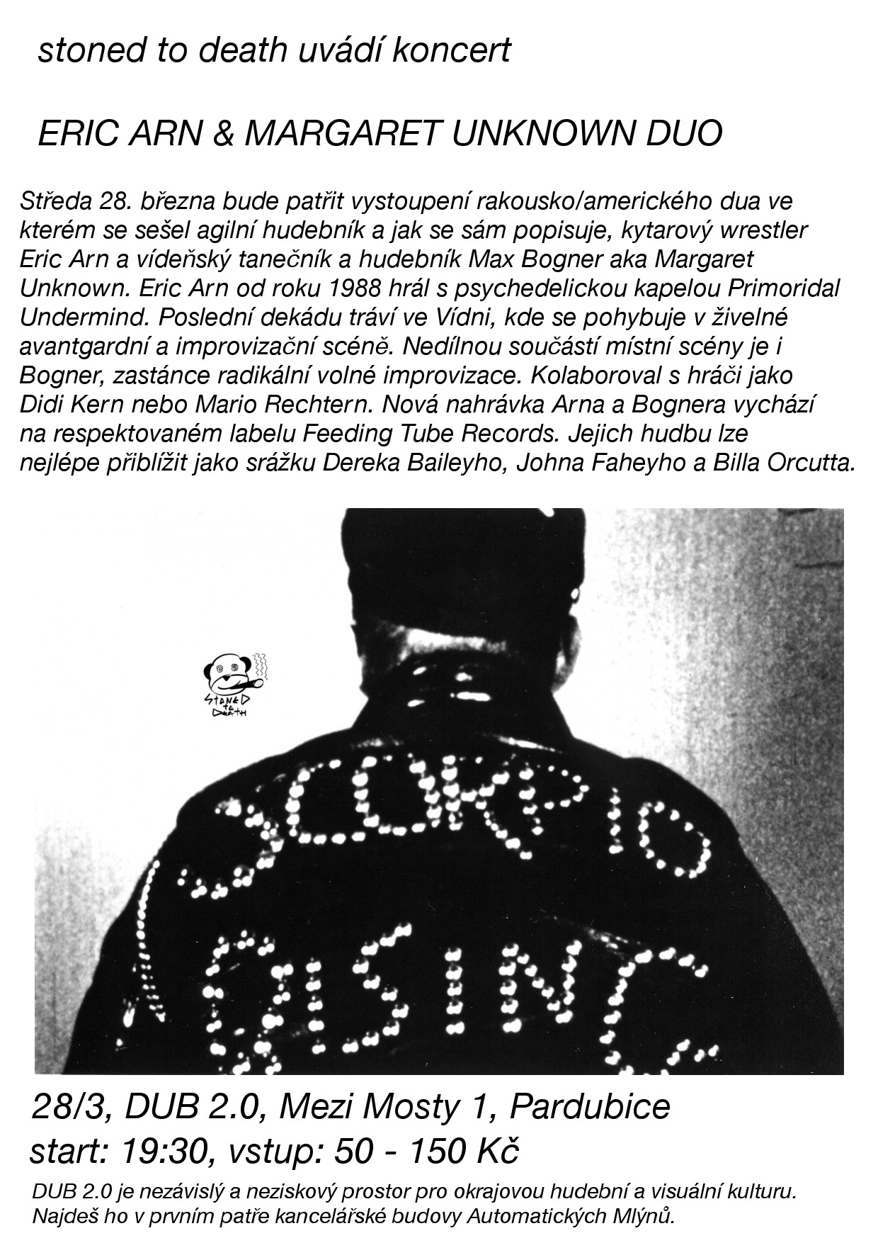 Středa 28. března bude patřit vystoupení rakousko/amerického dua ve kterém se sešel agilní hudebník a jak se sám popisuje, kytarový wrestler Eric Arn a vídeňský tanečník a hudebník Max Bogner aka Margaret Unknown. Eric Arn od roku 1988 hrál s psychedelickou kapelou Primoridal Undermind. Poslední dekádu tráví ve Vídni, kde se pohybuje v živelné avantgardní a improvizační scéně. Nedílnou součástí místní scény je i