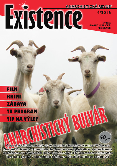 Vyšlo nové číslo anarchistické revue Existence, tentokrát v bulvárním provedení: kozy na obálce a nové rubriky uvnitř: krimi, film, zábava, TV program, tip na výlet… Prostě „anarchistický bulvár“. Ale nedejte se zmást, naleznete tu i tradiční rubriky o aktivitách domácího antiautoritářského hnutí, z historie anarchistického hnutí atd. Více o čísle se dočtete ZDE. K sehnání na obvyklích místech nebo ke stažení tady.