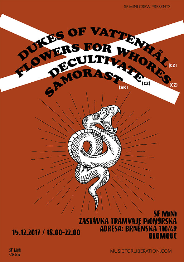 Tenhle prosincový pátek nás na SF MINI čeká nekompromisní hardcore/metalová nálož zpestřená slovenským emo/HC/punkem! Flowers For Whores Našlapaný metal/hardcore s velkou silou v textech. Každá jejich nahrávka je silnej zářez do pažby a koncert zárukou nejen propocenýho trika. Sleduj třeba zde: https://www.youtube.com/watch?v=xoVjBvZKjtE Dukes of Vattenhål Vládcové Napajedel jsou možná trochu utajená kapela, ale když začnou hrát, tak je nepřeslechneš. Totální hardcore/metal jízda s mocným soundem! Neváhej to omrknout tady: https://dukesofvattenhal.bandcamp.com/ Samorast: Emo/hardcore/punk ze Slovenska. Nedávno vydali novou desku, poslouchej a stahuj zde: https://samorast.bandcamp.com/ Decultivate Nová a docela aktivní kapela, která sdílí část členů s Flowers. Jejich špinavý metal/hardcore dávej tady: https://decultivate.bandcamp.com/