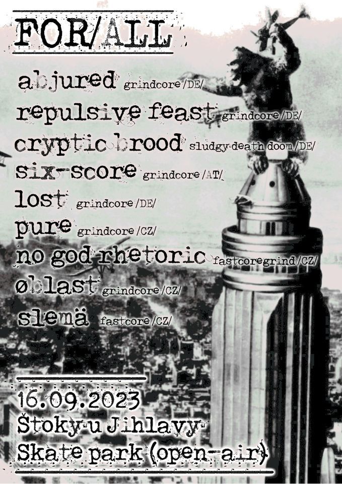FOR/ALL aneb návrat do Štok aneb proč taky neoživit Štoky? Ve Štokách to vždycky vřelo, tak se sem po pár letech odmlky Grindcore vrací a to v podobě jednodenního open-air festivalu v prostředí Štockého „Skate Parku“, který disponuje optimálním zařízením pro festival tohoto ražení, za nímž se rozkládá i plácek vhodný pro stanování.