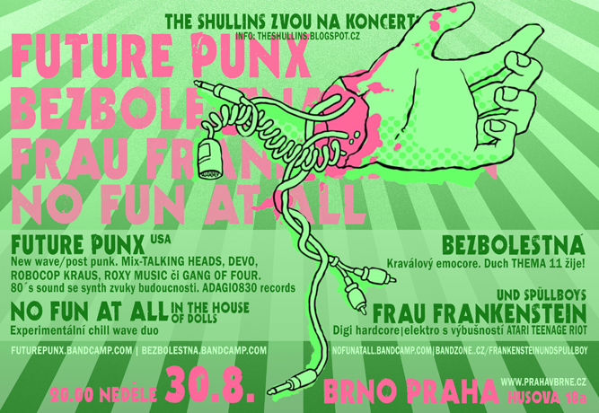 FUTURE PUNX (USA) - Brooklynská pětka přijíždí roztančit brněnskou Prahu svým osobitým mixem kapel TALKING HEADS, DEVO, ROBOCOP KRAUS,ROXY MUSIC či GANG OF FOUR. 80-tkový post punkový/new wave sound protkaný synth zvuky budoucnosti. Jak sama kapela uvádí snahou je skloubit jejich dvě lásky,kterými jsou punk rock a dance music. Živelnost, post punkové hrátky postavené na rytmice a výrazné groovy base jsou dohromady tmeleny klávesovými zvuky, které nahrávají decentní kytarové lince. Pulzující a zároveň značné hravá hudba Future Punx dává tušit, že tahle parta tvořena členy kapel Teenage Cool Kids / Fergus & Geronimo / Wax Museums se postará o nevšední letní brněnskou neděli. Nová deska vychází u Adagio830 records, které stojí za deskami Comadre, Aussitot Mort, Haram, ... https://futurepunx.bandcamp.com/ http://futurepunx.tumblr.com/ https://www.facebook.com/FuturePunx BEZBOLESTNÁ - Kraválový emocore, který uměly hrát jen kapely z HáKáče v čele s Themou 11. Najdeme tady ex-členy La Prosperité, Václav Klaus nebo Goodbye Blues. Na svém kontě má split s Peleton a zářež pro kompilaci Crooked to Death. Obé vyšlo na kazetě díky Stoned To Death records. http://bezbolestna.bandcamp.com/ FRAU FRANKENSTEIN UND SPŰLLBOYS - Digi hardcore /elektro se dvěma MC´s evokující výbušnou náladu ATARI TEENAGE RIOT. (Ex-)Členové a členka kapel Piča z hoven, Humen Steak, Průmyslová smrt, atd. http://bandzone.cz/fraufrankensteinundspullboy https://www.facebook.com/FrauFrankensteinUndSpullboy NO FUN AT ALL IN THE HOUSE OF DOLLS - Soundtrack pro ztracené duše. Experimentální chill wave duo největších fanoušků kapely VUM. Člen a členka MY DEAD CAT a PIČA Z HOVEN. https://nofunatall.bandcamp.com/releases https://www.facebook.com/pages/No-Fun-at-All-in-the-House-of-Dolls/850805001627465