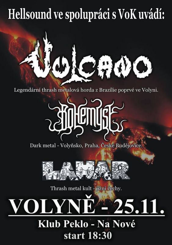 Fanoušci old school metalu pozor!!! V pondělí 25.11.2019 přijede do jižních Čech, konkrétně do Volyně z brazilského sao Paula, old school metalová banda VULCANO. Založeno 1981. (!!!) Na svém kontě mají 10 velkejch desek nabušenejch mixem poctivýho black/death/thrash metalu. Na tomto tour zahrají komplet věci z jejich první LP Bloody Vengeance. Pokud máš rád starobní obskurní metal, přijď podpořit. Pochopíš, kde raná Sepultura čerpala inspiraci. Společně s nima zahrají věci z připravované nové desky BOHEMYST (ex-Avenger) ...ještě víc doomovější, ještě víc  temnější. Třetí kapelou večera bude písecké thrash komando LAHAR.