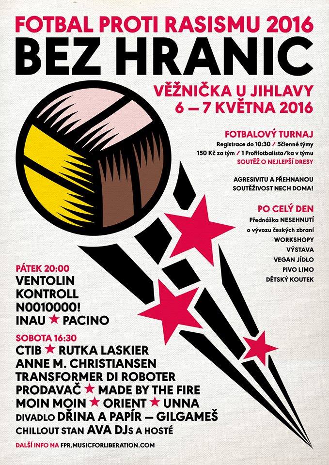 O víkendu 6.- 8. května se koná už 9. ročník Fotbalu proti rasismu ve Věžničce. FOTBALOVÝ TURNAJ Registrace do 10:30 / 5členné týmy / 150 Kč za tým / max. 1 profi fotbalista/ka v týmu Již tradičně vyhlašujeme SOUTĚŽ O NEJLEPŠÍ DRESY. Fotbal a celý den je sranda a zábava, chceme se sejít a vzájemně se obohacovat, žádná přehnaná soutěživost nebo agresivita není vítaná. PO CELÝ DEN Přednáška NESEHNUTÍ o vývozu českých zbraní VEGAN JÍDLO PIVO LIMO DĚTSKÝ KOUTEK PING PONG STAGE V pátek od 20:00 zahrají INAU, PACINO, VENTOLIN / KONTROLL / N0010000! V sobotu od 16:30 zahrají CTIB / RUTKA LASKIER / ANNE M. CHRISTIANSEN / MOIN MOIN / PRODAVAČ / ORIENT / MADE BY THE FIRE / TRANSFORMER DI ROBOTER / UNNA DIVADLO DŘINA A PAPÍR — GILGAMEŠ CHILLOUT STAN AVA DJS A HOSTÉ PRAKTICKÉ INFO - Koncert v hospodě bude nekuřácký, prosíme o vzájemný respekt! - Na akci netolerujeme sexistické, rasistické ani homofobní projevy! - Cesta ke hřišti a parkování bude značená, nezajíždějte zbytečně do vesnice, není to potřeba. - Behěm dění udržujte pořádek, ať je to tam takový jako před tím, než jste tam přijeli. - Na místě si můžete postavit stan na měkkoučké louce. - A novinka od minulého roku - vychází od stížností stálých obyvatel Věžničky: Pokud si s sebou berete psy, zkuste zamezit jejich pohybu mimo areál louky a hospody U Tadeáše. DALŠÍ INFO NA fpr.musicforliberation.com
