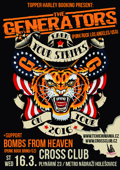 The Generators z Los Angeles vydávají nové album “Earn Your Stripes“ u Randale Records a přijíždí na své 13. evropské tourné. Skupinu založil zpěvák Doug “Dagger“ Kane po rozpadu kultovních Schleprock v roce 1997. Schleprock koncertovali od půlky 80. let a stihli projet USA s několika zásadními kapelami jako Green Day, the Specials, Sublime, Face to Face nebo Nofx. Kariéru ukončili zhruba těsně před zpopularizováním punk rocku v podání the Offspring a dalších kapel vycházejících na Epitaph Records. The Generators se ale vydali opačným směrem a zabarikádovali se v zákopech první a druhé vlny britského punk rocku respektive oipunku reprezentovaném the Clash, the Damnes, Buzzcocks a rozhodně Angelic Upstarts. Když k tomu všemu přidali nutou inspiraci v dalších jihokalifornských kapelách jako Bad Religion a Social Distortion, výsledný zvuk byl na světě a the Generators se ho po zuby drží dodnes.